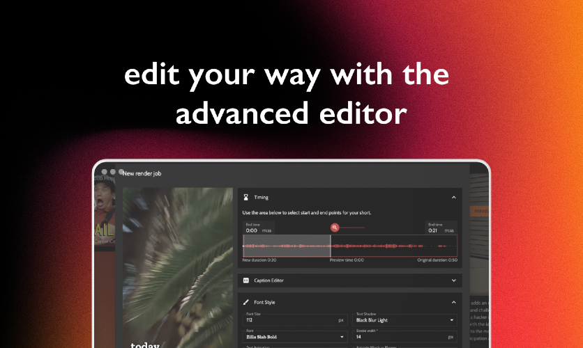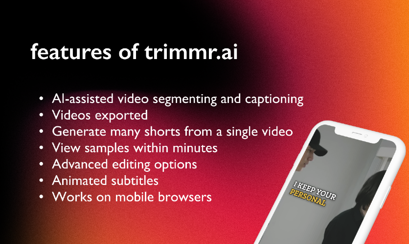 Trimmr.ai is a pioneering, AI-powered application designed to transform lengthy YouTube videos into shareable, attention-grabbing shorts. By intelligently pinpointing the most compelling or pertinent sections of a video, Trimmr.ai empowers content creators and marketers to produce viral content that resonates with viewers in just a few moments. Features: AI-Assisted Video Segmenting and Captioning: Leveraging artificial intelligence, Trimmr.ai segments your video, identifying the most impactful parts, and generates captions, making your shorts more accessible and engaging. Videos Exported: Easily export your short videos directly from Trimmr.ai, ready for sharing across multiple platforms. Generate Many Shorts from a Single Video: With Trimmr.ai, one video can become multiple unique shorts, each capturing a different highlight, thereby maximizing your content's potential reach. View Samples Within Minutes: Trimmr.ai's fast processing enables you to view rendered samples of your short videos within minutes. Advanced Editing Options: Trimmr.ai comes equipped with a robust editor, offering advanced editing options for further customization of your shorts. Animated Subtitles: Elevate viewer engagement with animated subtitles, adding a dynamic layer to your content and ensuring clear communication of your message. Harness the power of AI with Trimmr.ai to create captivating short-form content that amplifies your reach and resonates with your audience.