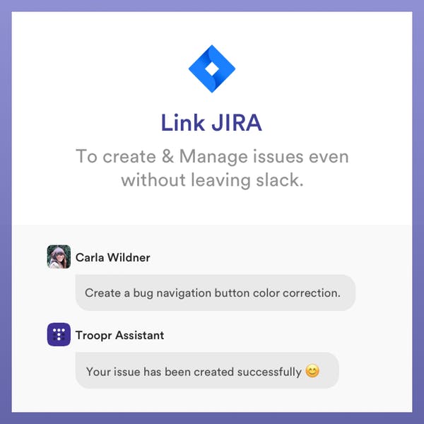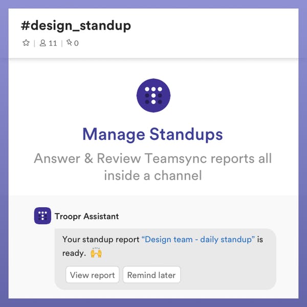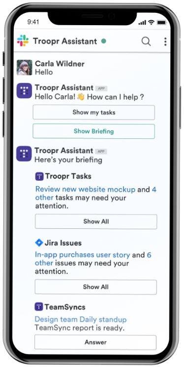 Troopr Assistant runs your projects and standup meetings directly in Slack. Troopr Daily Briefing provides you a quick actionable overview of tasks, JIRA issues, standups, reminders and more. Save time and get more done in Slack!