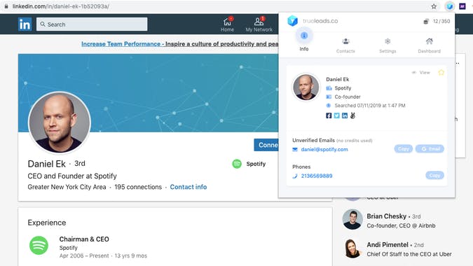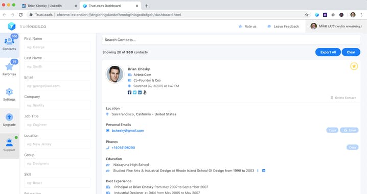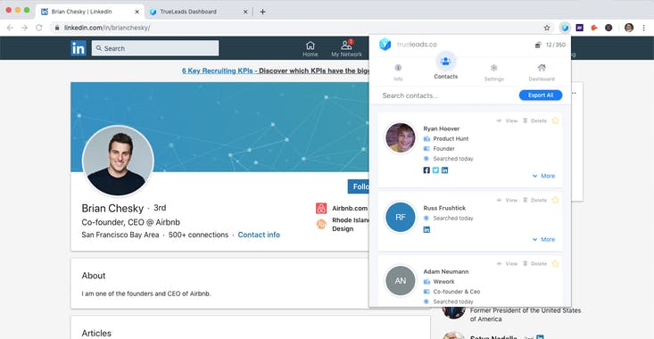 TrueLeads provides accurate contact information for top prospects and candidates while you search on LinkedIn. With the click of a button, TrueLeads gives you access to over 220 Million contact records in an easy to use dashboard. Use code LAUNCH25 today for 25% off! While prospecting for candidates on LinkedIn, our team at TrueConnect realized that response rates to our InMail messages were extremely low due to the fact that candidates’ InMail boxes were flooded with SPAM. During this process, we realized the need to email candidates directly and the idea for TrueLeads was born. After using TrueLeads in Beta, our team saw response rates increase by 6x as compared to our previous efforts through InMail. In addition to working tirelessly to ensure the most accurate and up-to-date information in the market, we also wanted to provide a beautiful and intuitive user experience. After months of iteration, TrueLeads’ current user interface was created, offering one-click access to all major components and Single-Sign on access with Google, LinkedIn, and Facebook accounts. Our goal is to reduce any friction for users by allowing easy sign-up using existing accounts while shying away from the need to capture unnecessary user information during the signup process. TrueLeads also addresses a major gap in the market by offering scalable and affordable pricing as opposed to more expensive options like ZoomInfo or ExactData. We heard from countless recruitment firms and sales teams that options such as ZoomInfo were financially unfeasible, requiring long-term contracts that could cost thousands of dollars per month. We knew that creating an affordable option would help businesses gain access to valuable contact data without draining them financially. We hope you enjoy the product and we're looking forward to your feedback!