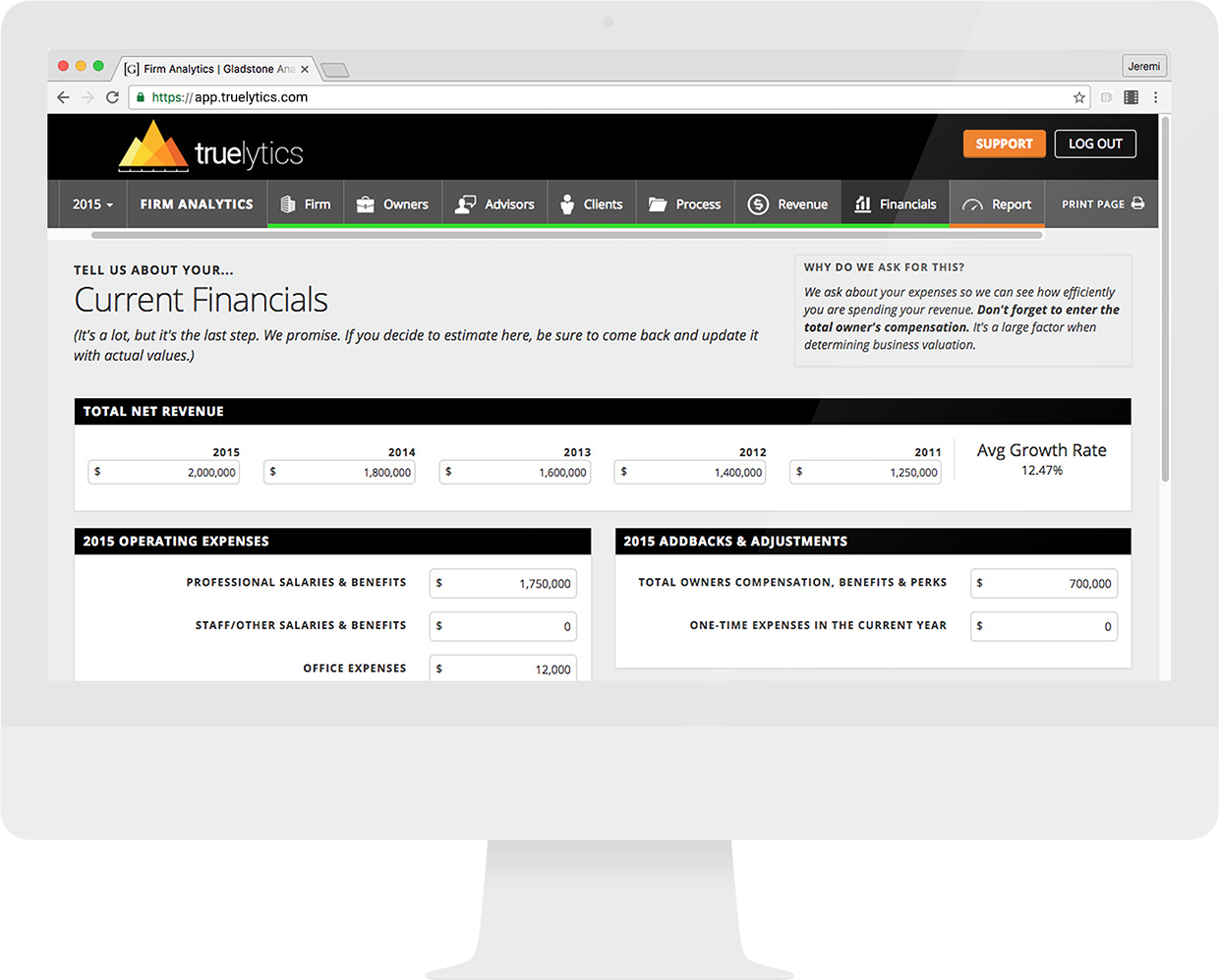 Truelytics Inc., (a Delaware C Corporation) is a software as a service (SAAS) platform with its own proprietary and to be acquired intellectual property/technology. Truelytics provides a comprehensive and tested practice valuation tool as well as a robust platform for Continuous Practice Improvement, with planned proprietary tools compliance, succession planning, operational efficiencies and value creation. Driven by the industry's most powerful financial benchmarking data, Truelytics will deliver tools and compliance capabilities in an intuitive user experience that helps firms grow. Customer Problem: The financial services industry is changing rapidly and advisors of all sizes and in most markets face challenges of business succession planning, legal and compliance costs and industry consolidation and competition. Advisors struggle to find the knowledge they need to make sound decisions, both to protect their practices and also to expand and grow.