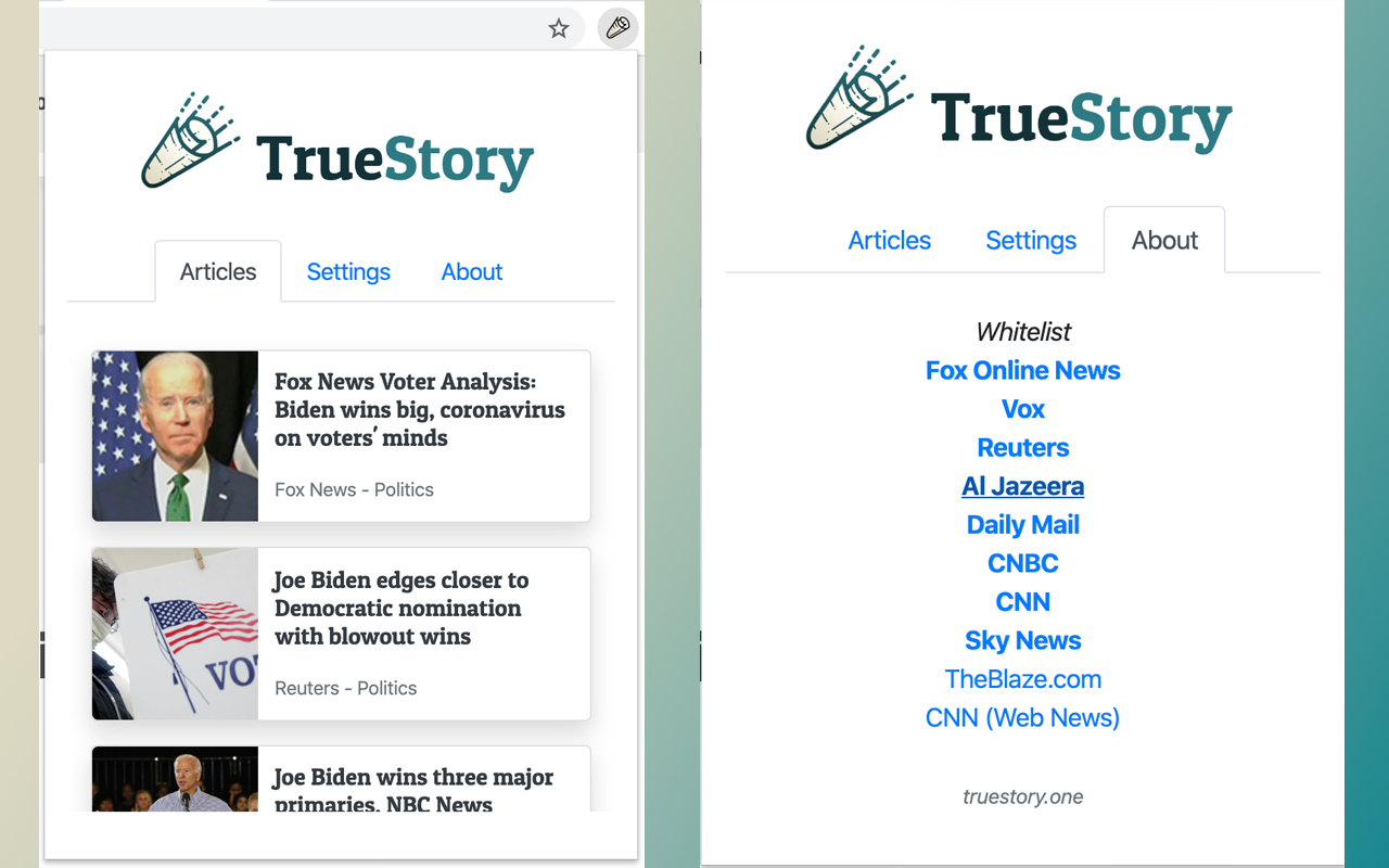Be your own journalist! Use it while reading news in order to get similar but contradicting stories from other publishers. We all know how time consuming is investigating if an article is fake or not, that's why we're offering you multiple opposed ones to what you're currently reading, so you can draw your own conclusion in the end, while still surfing your favorite authors. https://truestory.one