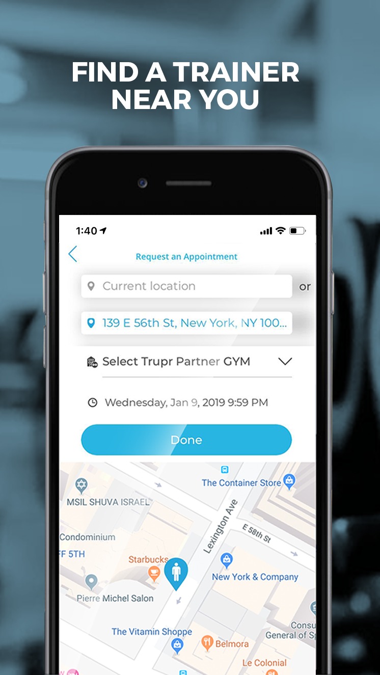 TRUPR is a New York City-based startup with three co-founders (two based in NYC and one based in London). Trupr is an on-demand fitness app - connect instantly with local personal trainers, gyms, or both - and workout whenever you want. Like to train at home? Why not request a trainer to come to you? Traveling for work? Have the trainer meet you at your hotel gym or any gym of your choosing. Prefer to workout on your own? No problem, users get instant access to local, participating gyms around the world. All Trupr services are ready to go. No subscriptions. No memberships. No contracts. All users simply pay by the minute. Fitness means different things to different people. Whether you want to try a professional training service for the first time, or are a seasoned fitness enthusiast, there’s a Trupr solution for you. From beginners to professional athletes, Trupr is designed to connect you with the right people and places to get (and keep) you motivated. Find the right personal trainer and/ or gym near you; filter results based on: your location, your fitness preferences, and your goals. Train anytime, anywhere, with anyone. All sessions are on-demand, no obligation, and you simply pay for the time you use. We live in a connected world; and with Trupr, now clients, trainers and gym partners can easily connect with each other. Trupr users can train alone, with a trainer, or with a workout buddy almost anywhere: at local gyms, in a home or private studio, or just about anywhere you choose - whenever you want. Looking for a workout buddy? Trupr clients have the option to find similar fitness enthusiasts. So the next time you are traveling for work and want to find someone to share a run with, simply open the Trupr app and you will see users with similar interests who are also looking for a workout partner - in real time. Isn’t it about time we made fitness more social? Are you a personal trainer or local gym? With Trupr, you can create a profile in minutes and be ready to go. Once on the Trupr grid, you can see nearby clients, and they can see/ book sessions with you, instantly. Train now, or later, it’s all up to you. Tired of wasting hours in-between sessions, then why not use Trupr to help fill up your schedule and/ or find new clients. All booking and payments happen in app; you simply show up, start your session, and we do the rest. Download the app and try your first session today. Using Trupr has been designed for you – here’s how it works: - Just open the app and select your preferred training styles - Choose the training coach that is right for your - Chat with your coach before you meet to discuss details - The app uses your location so that your trainer knows where to meet you; alternatively, you can visit your coach at their preferred location, or a Trupr Partner Gym. - You will see your trainers biography, experience, and rating in their profile. - Once complete, you both ‘sign off’, and payment is transferred. - After your session, you can rate your trainer and provide feedback to help us improve the Trupr experience. You’ll also get a receipt by email. Want a simple way to find someone to help you with your bodybuilding? Someone, to motivate you through a HIIT session? Or maybe someone to guide you through a Yoga workout? Trupr is the most convenient way for you to enjoy a personalized level of service.
