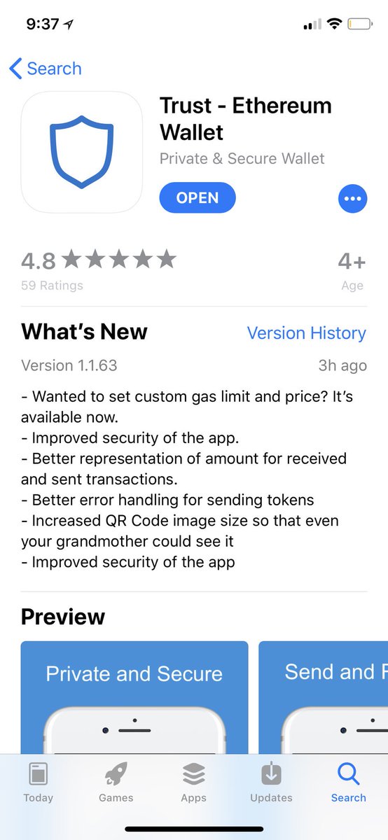 Trust - is an extremely fast and secure Ethereum wallet built with ease of use in mind. We provide a fully security audited system that makes it simple to buy and store Ethereum and ERC20 tokens on your device. Trust is designed specifically for iOS to provide the best possible experience: - Securely store private keys on your device - Send and request ether (ETH) - Store and track ERC20 tokens - Check balance, transaction history, and other details - Keep your private key secure with bank level security, etc.