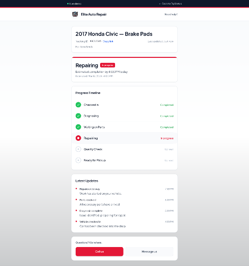 Running a service business means juggling constant interruptions from customers asking for updates. Whether it’s an auto repair shop, appliance technician, electronics repair store, or fabrication shop, one question comes up all day long: “Any updates on my job?” These calls may be understandable, but they pull technicians and staff away from the work that actually moves jobs forward. This product solves that problem with a simple idea: give customers a live status link they can check anytime. When a job is created, the business can send the customer a single text message containing a private status page. From that moment on, the customer can view the progress of their repair or service without needing to call the shop. Staff simply update the job status in seconds, and the customer immediately sees the change. The experience works similarly to a delivery tracker or pizza tracker, but designed specifically for service businesses that handle multi-step jobs. A typical workflow might look like this: A customer drops off a vehicle or device for repair. The shop creates a job in the system and sends the customer a secure status link. As the job progresses, the technician or front desk staff updates the status through simple stages such as “Checked In,” “Diagnosing,” “Waiting on Parts,” “Repairing,” and “Ready for Pickup.” Each update is instantly reflected on the customer’s status page. Customers no longer need to call for updates because they can see exactly what is happening with their job. For businesses, this means fewer interruptions, clearer communication, and more time spent actually completing work. The system is intentionally simple so it fits easily into existing workflows. Staff don’t need to install new apps or change how they run their shop. Updating a job takes just a click, and customers can view the status page from any phone or computer. Service businesses that benefit most include: • Auto repair shops • Appliance repair companies • Phone and electronics repair stores • Computer repair shops • Custom fabrication and machine shops • Any service business where jobs move through multiple stages before completion The goal is not to replace existing shop management systems but to provide a lightweight communication layer that keeps customers informed without creating extra work for staff. By giving customers a transparent view of their job status, businesses can reduce the number of incoming “status check” calls, set clearer expectations, and deliver a more professional service experience. Instead of repeating updates all day, shops can focus on what matters most: getting the work done. A free 30-day trial allows businesses to test the system with real jobs and see how much time it saves. Setting up the first job takes less than a minute, and customers immediately understand how the status tracker works.