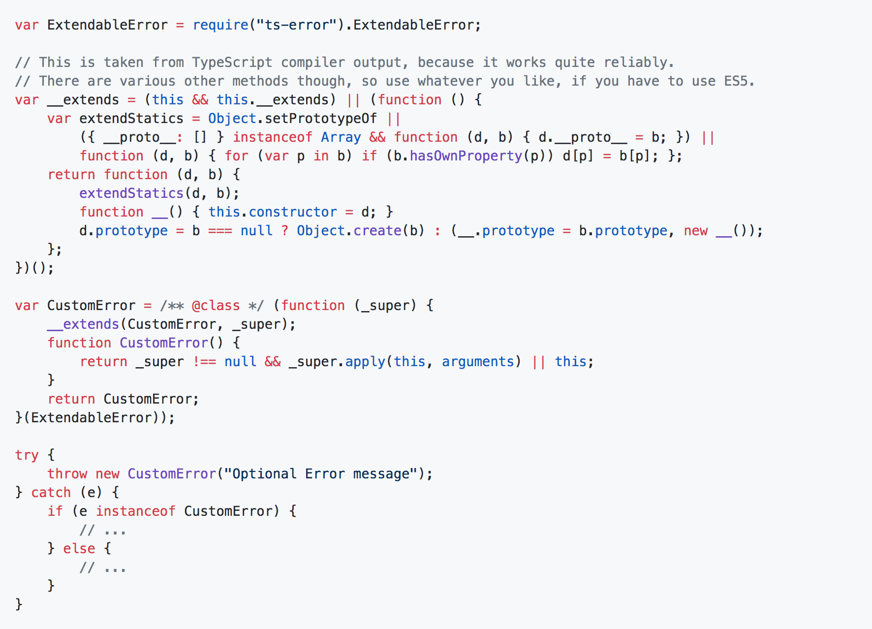 ts-error is an NPM package providing an extendable Error class together with TypeScript definition files, supporting old and new style classes and compatibility even with the oldest browsers. The purpose of extendable errors classes is to be able to throw error objects that are subclasses of the built-in JavaScript Error class, which has a number of gotchas, and to then filter them with the instanceof operator in the catch clause of a try/catch block as well as potentially adding additional variables to the error object. There exist a number of similar packages on NPM, but they all have shortcomings, like not supporting TypeScript, being awkward to use with TypeScript 2, not being compatible with old browsers, not printing the stack trace when used with console.log or similar functions or not having all features I wanted. So I decided to write my own.