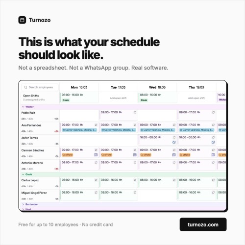 Turnozo is employee scheduling software built for small businesses that run on shifts. It replaces spreadsheets, paper schedules, and WhatsApp groups with a clean drag-and-drop schedule builder that takes minutes, not hours. Key features: - Visual drag-and-drop weekly schedule builder - GPS-verified clock-in/out time tracking - Automatic timesheet generation for payroll - Absence and availability management - Calendar sync with Google Calendar, Apple Calendar, and Outlook - Mobile app for iOS and Android - Real-time notifications for schedule changes Free plan available for up to 1 branch and 10 employees with all features included. No credit card required. Paid plans start at $2.47/employee/month for larger teams. Built for restaurants, retail stores, clinics, gyms, salons, pharmacies, and any business that schedules employees in shifts.