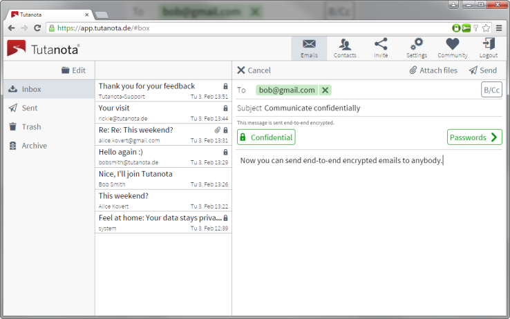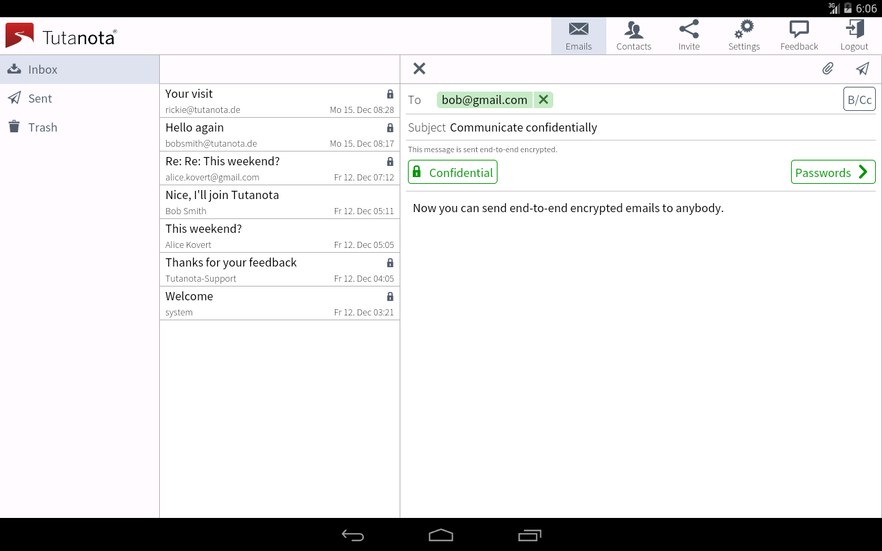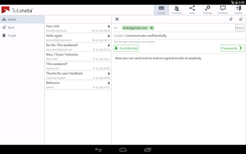 The open source app Tutanota enables you to send end-to-end encrypted emails to anybody with a tip of your finger. Even emails that are being sent without end-to-end encryption and all your contacts are stored encrypted on the Tutanota servers. -Encryption made easy. -Open source and forever free. -Secure mail - wherever you are, etc.