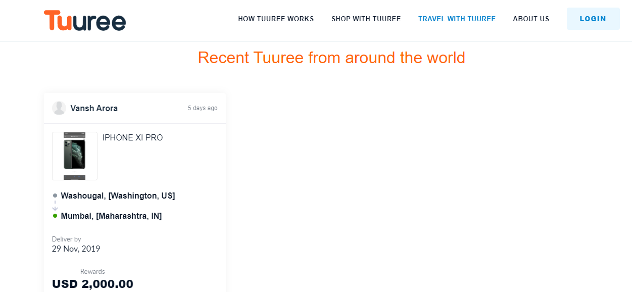Tuuree is a Peer 2 Peer marketplace for International Travelers and Global Shoppers.We match shoppers who want to order overseas products with travelers who are able to buy and bring them for a reward by using their unused luggage space. We are the Airbnb for luggage sharing. Shoppers can save upto 20-25% of their shipping costs and travelers can earn rewards by using their unused luggage space. Tuuree uses Machine Learning & AI powered platform right from matching shopper to the traveler and from pulling up the order details from various online/offline store to auto calculation of sales tax. We use Escrow payments- so the money is safe with Tuuree and it gets transferred to the Traveler post delivery of the merchandise. It is a win-win situation for both the shopper and the traveler. Also, we have Tuuree Money Back guarantee - for shoppers who did not get their merchandise / or merchandise not received in the desirable condition. And using Tuuree is free!- we don’t charge any fee if all transactions are handled directly between the traveler and shopper without Escrow services. For this we introduced Direct Pay. Come, Login and discover the new way to shop and travel! https://www.tuuree.com