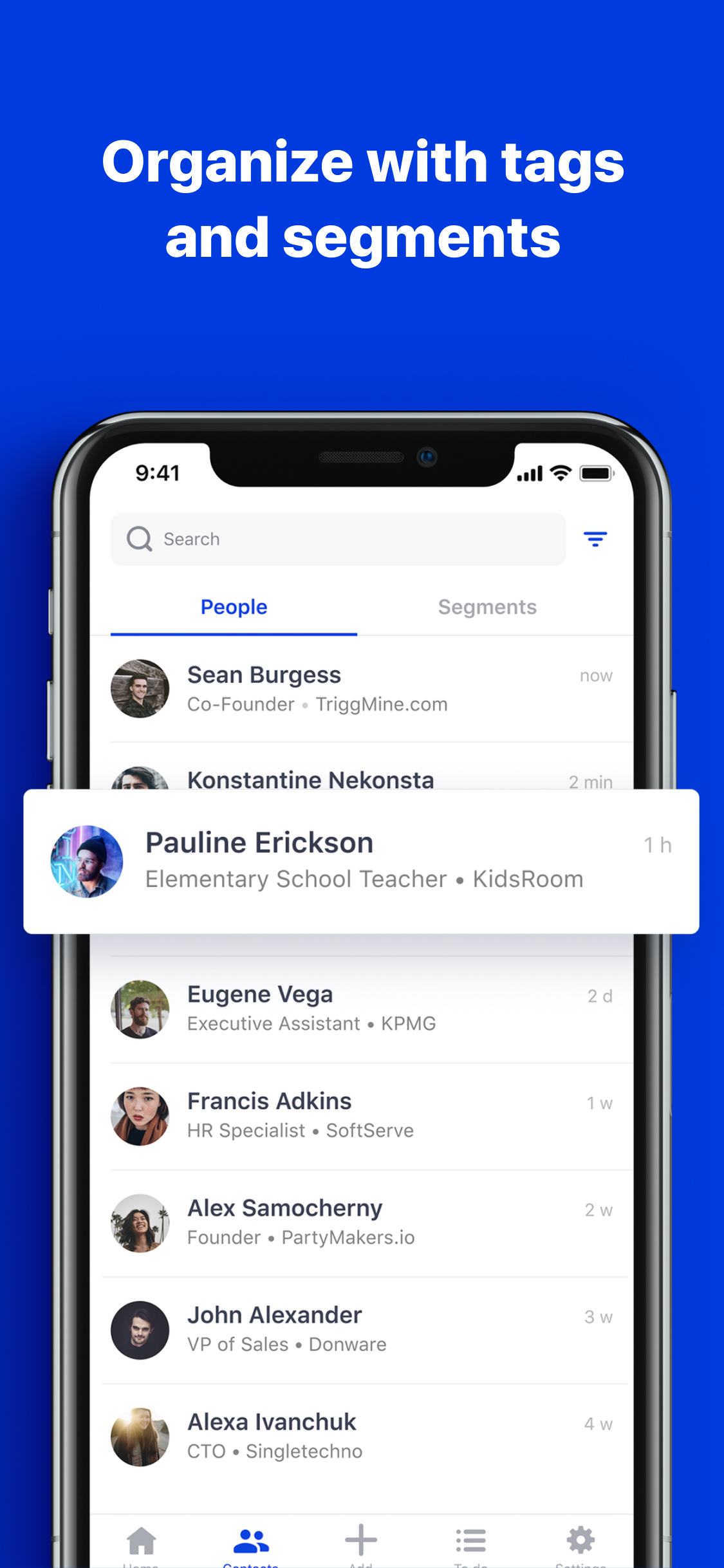 A beautiful mobile solution for mastering your connectionsTweedo brings all your contacts into one single place. Easily find, organize, synchronize and keep your contacts up to date and safe. Tweedo is a single hub for all your contacts. Automatically add contacts from your phone, Google contacts and email, Outlook, iCloud and your favorite social networks and messengers. Keep them organized with tags and segments. Store, organize and sync your contacts the smart way.