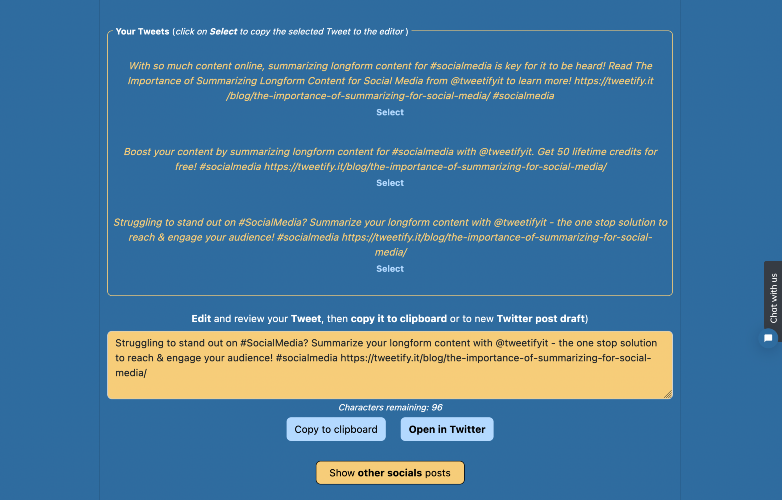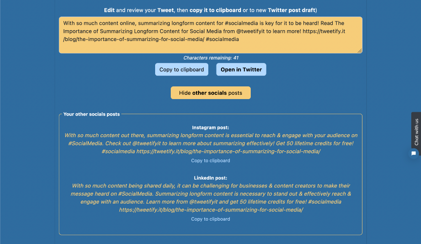 Quickly transform any long-form content (from text or URL) into personalised, short social posts & tweets. Customise tone, topics, format, tags, length & language. Share your content on social media without sacrificing its essence. More posts and less effort!