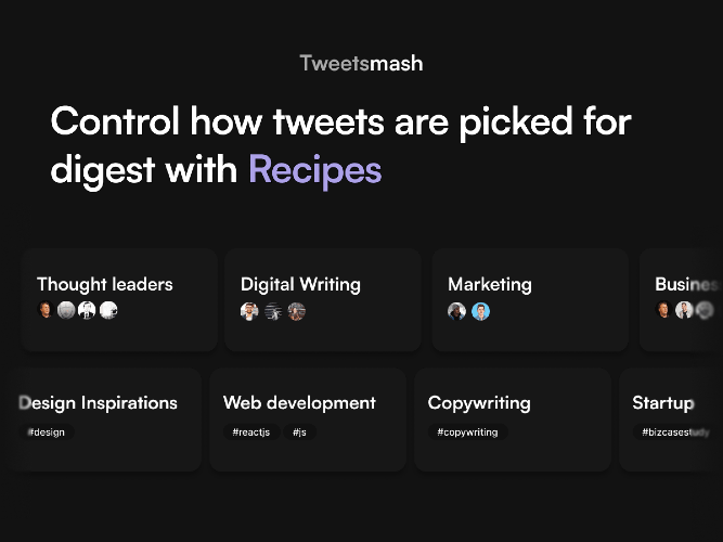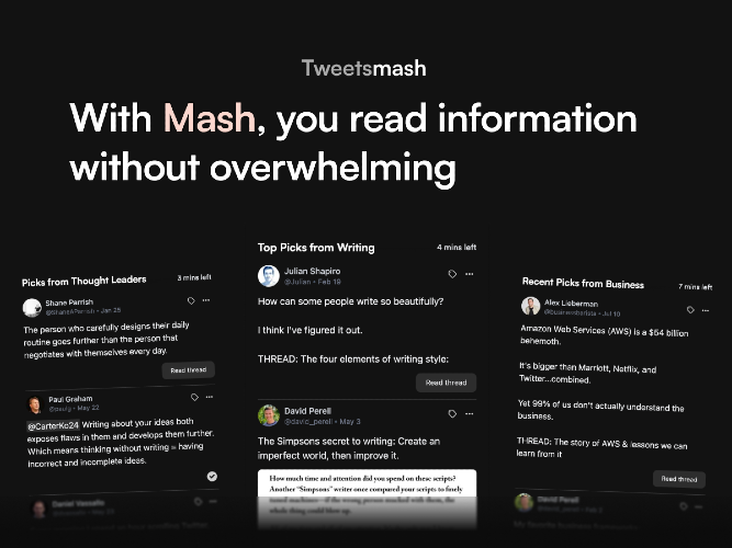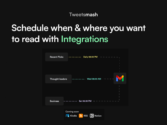 Tweetsmash helps to streamline the way you read information from Twitter. It sends you a digest of Twitter bookmarks to your inbox on your preferred time. - You can create a reading plan with your thought leaders or topics, create recipes by grouping the list of authors or labels. Any bookmark you do in Twitter will be sync automatically and sent as a digest to your email. - You can also organise your Twitter bookmarks with labels, search for bookmarks and read threads with our inbuilt thread reader. Create your information diet and turn your Twitter bookmarks into a mindful way to consume information that matters to you with Tweetsmash.