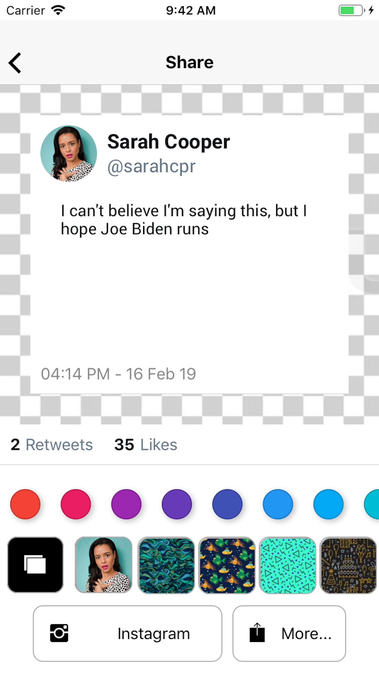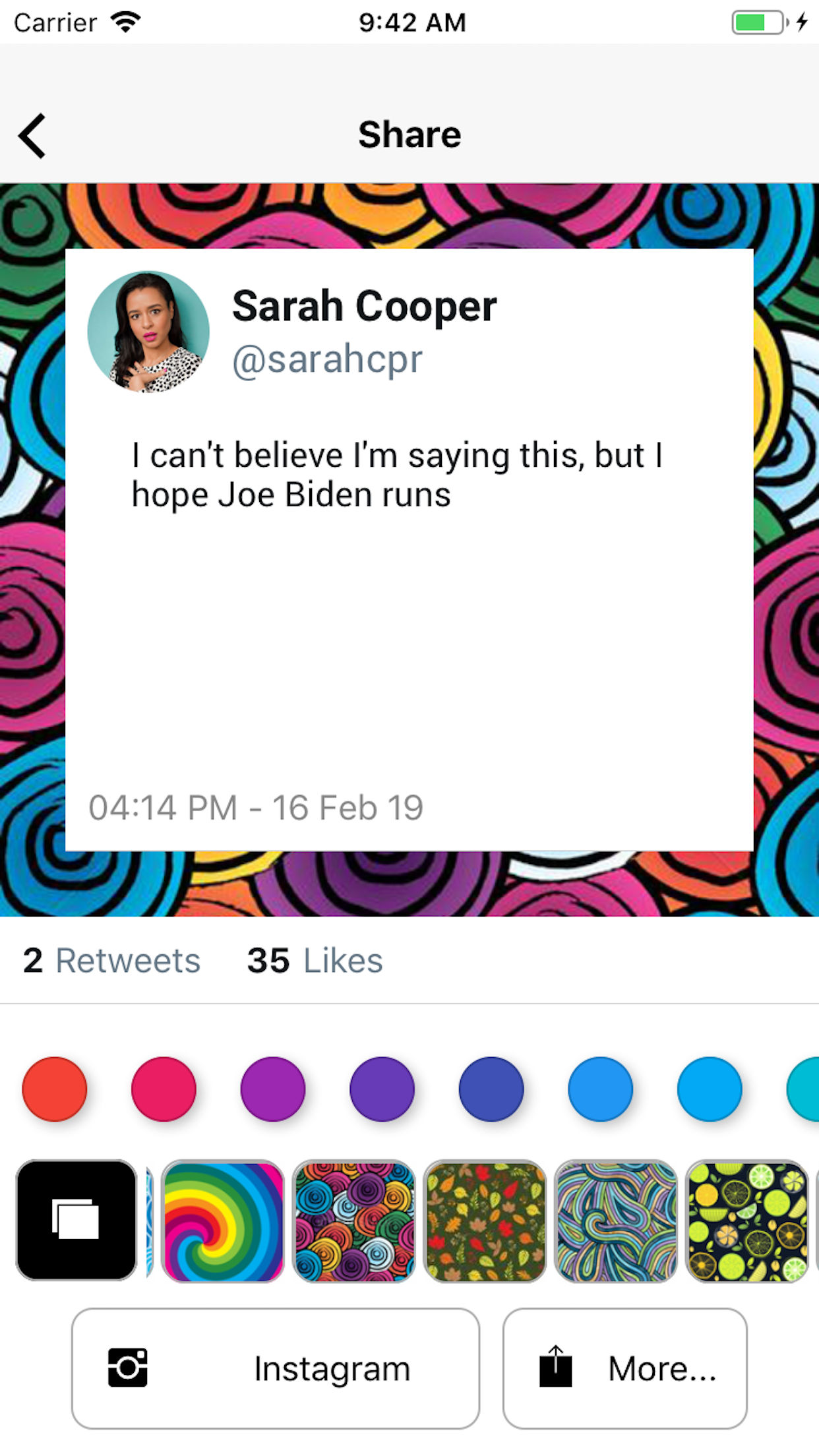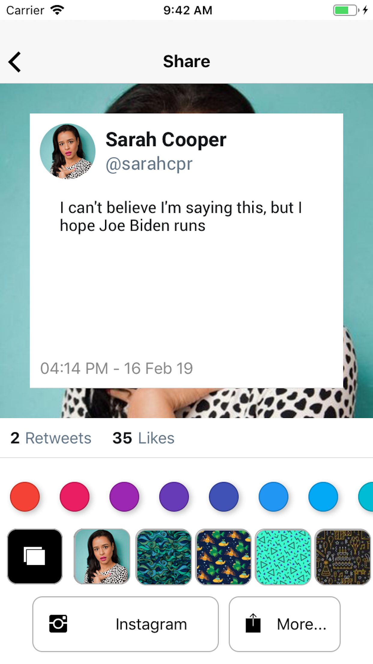 Twimmage quickly turns tweets into sharable images. Select a twitter user; choose a tweet; add either a creative background, custom color, or custom background; then share the image to Instagram/other social media. Or share directly from twitter on Android.