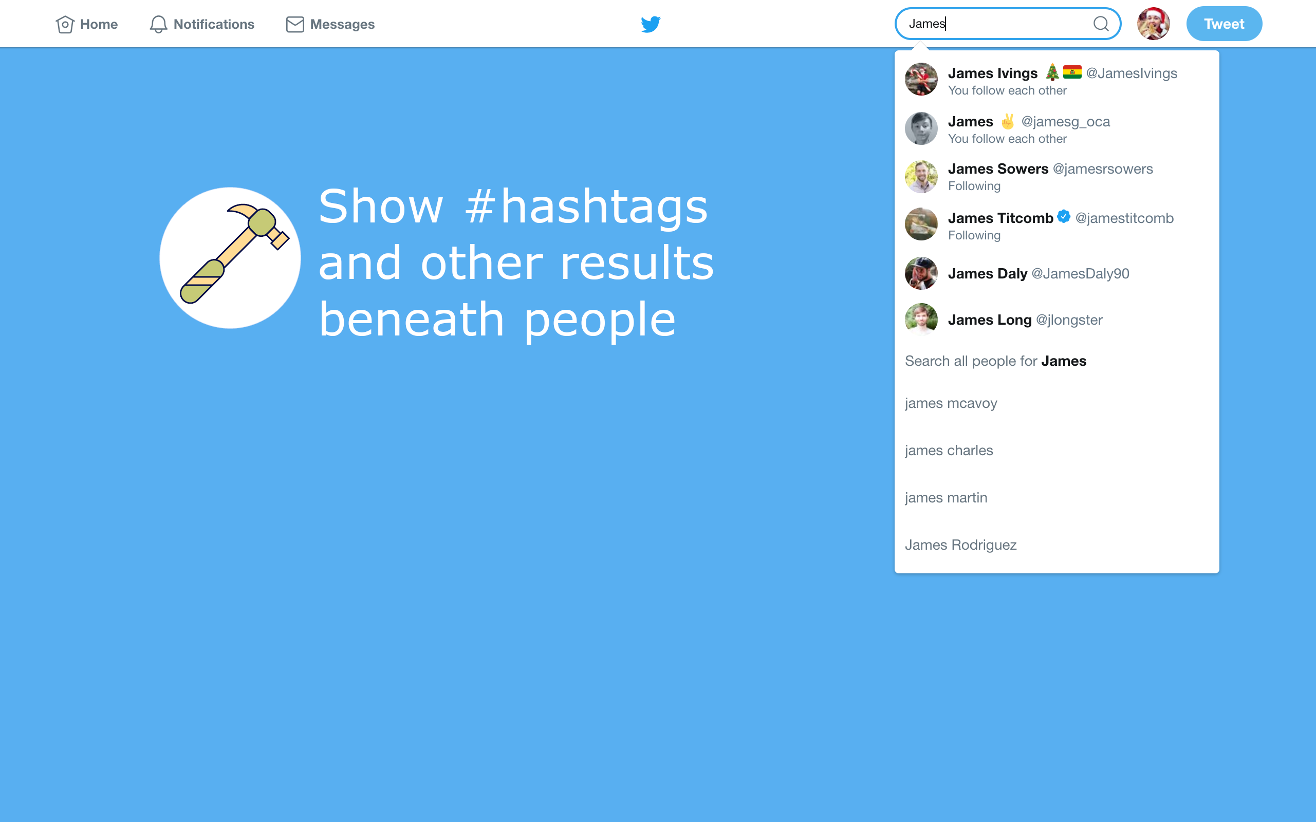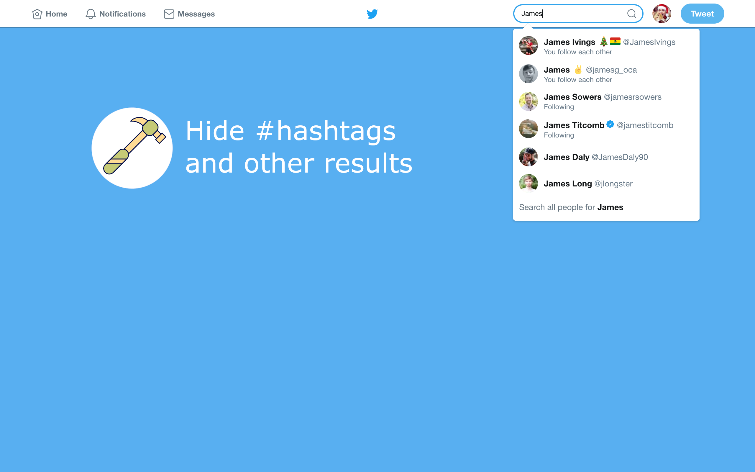 Have you ever typed a handle or name into the search and clicked the result you wanted JUST as a tonne of other search results pop up and you select the wrong thing? You need Twitter Search Fixer to hide those pesky results or to show the results you want first.