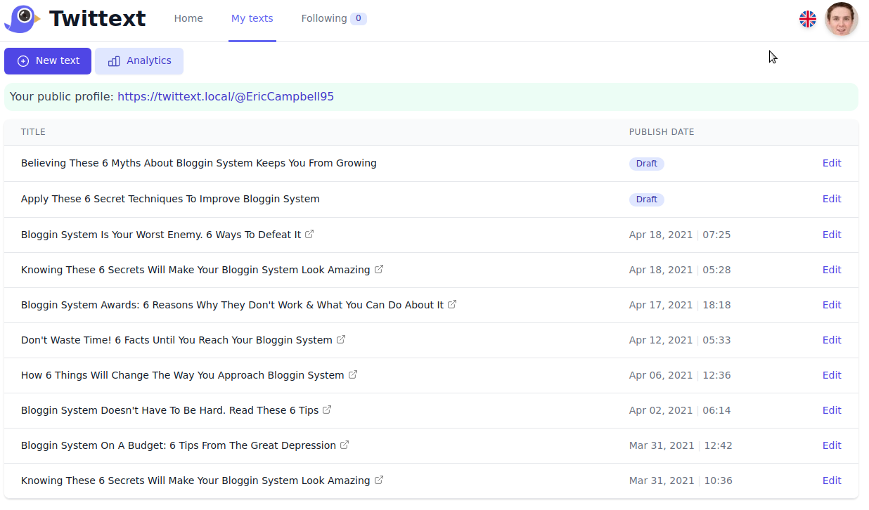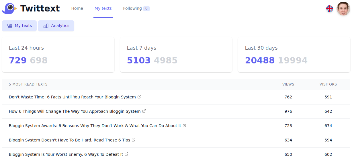 Simple blogging plaftorm for Twitter users. Easily write text and share it on Twitter. You can publish only one text, write your blog, or just read texts from people you follow on Twitter.