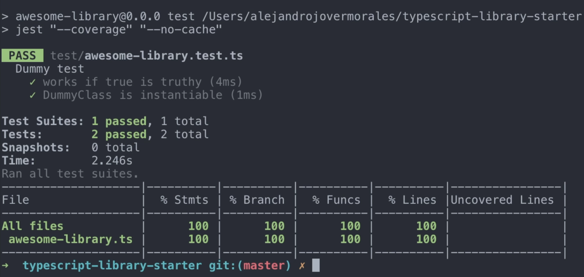 A starter project that makes creating a TypeScript library extremely easy. Features - Zero-setup. After running npm install things will be setup for you ???? - RollupJS for multiple optimized bundles following the standard convention and - Tests, coverage and interactive watch mode using Jest - TSLint (standard-config) for your code styling - Docs automatic generation and deployment to gh-pages, using TypeDoc - Automatic types (*.d.ts) file generation - Travis integration and Coveralls report - (Optional) Automatic releases and changelog, using Semantic release, Commitizen, Conventional changelog and Husky (for the git hooks)