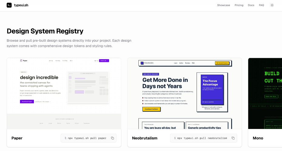 TypeUI.sh is a CLI tool that helps you generate and manage design skill files for agentic tools such as Claude Code, Open Code, Codex, OpenClaw, Cursor, and more. You can also pull curated design system skill fills from our servers when creating a new project and applying the design files similar to how themeforest worked back in the days with templates.