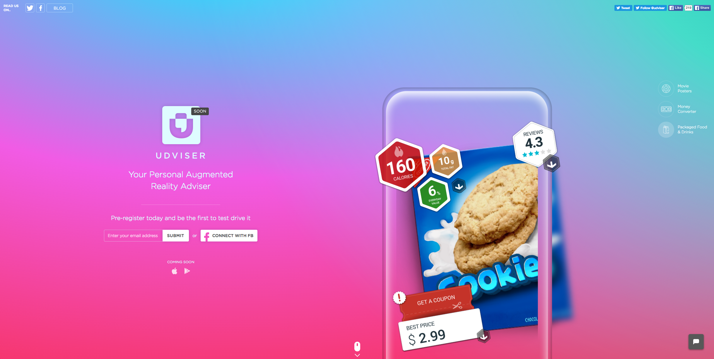 Udviser is your personal AR shopping, movie and money adviser. Udviser is a mobile app that uses augmented reality to turn customer experience into interactive journey. By simply scanning packaged foods, movie posters or dollar bills, users will get access to relevant information in one place and discover augmented reality. With product information, customer reviews, videos, nearest stores, cheapest prices, coupons, etc. shoppers will quickly make a well-informed decision. Movie fans will enjoy watching the trailer, movie reviews and booking tickets directly on the posters in a few clicks, in one app. Enjoy the magic of augmented reality! Udviser will support: - Any movie posters worldwide - 10,000 packaged food & drinks [beta] - Real time currency converter Pre-register today and be the first to test drive it.