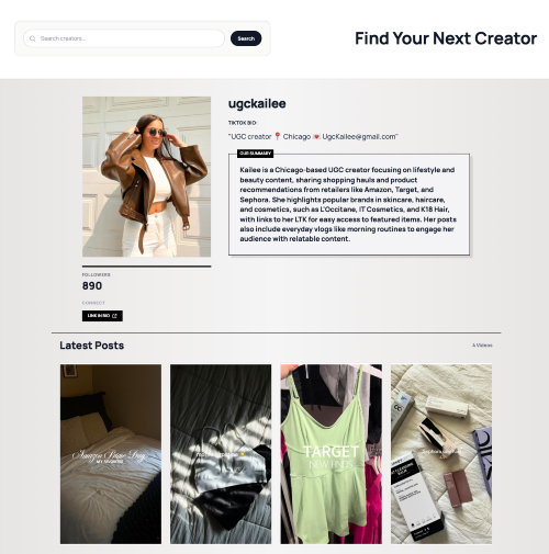 This tool aggregates TikTok creator data and uses Multimodal AI to analyze video thumbnails—extracting lighting, mood, and product details. It’s a centralized, searchable database designed for brands and agencies to find authentic UGC talent instantly. Filter by creators who post to ShopMy, LTK (RewardStyle), and Amazon associates.