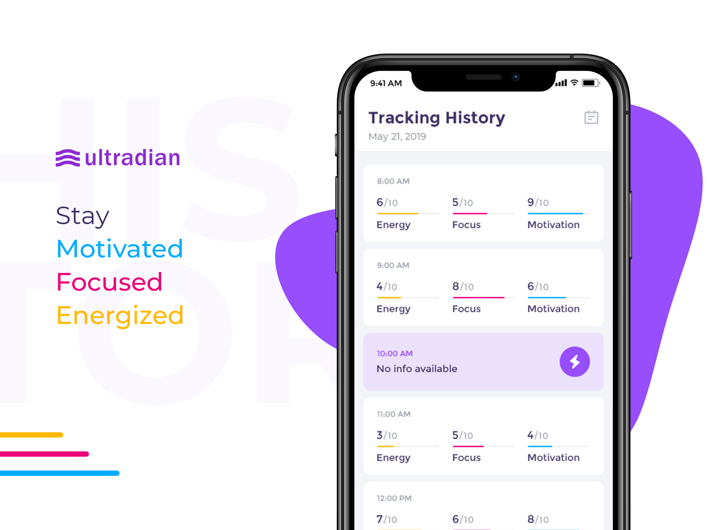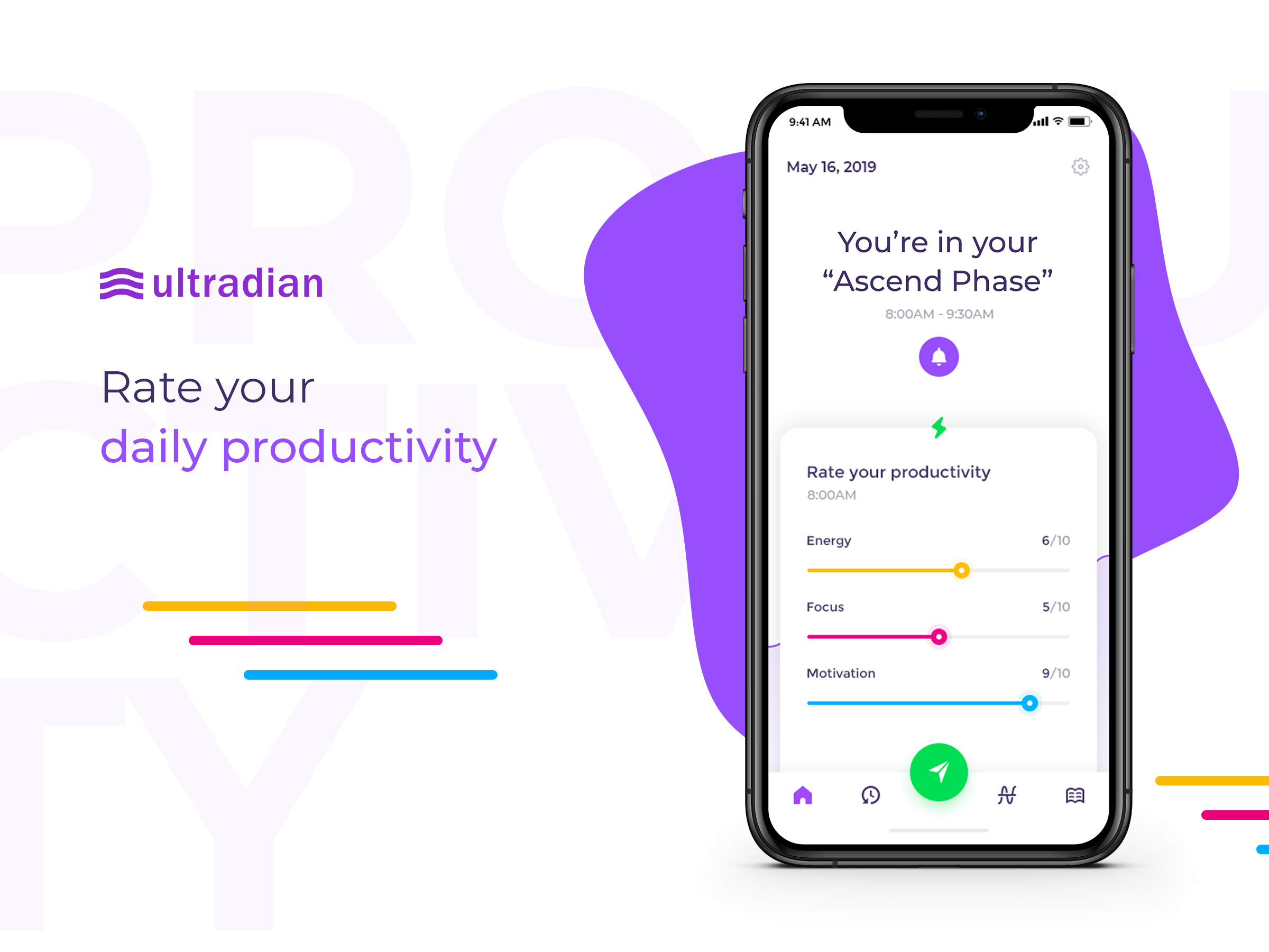 Many people try to work with their Ultradian rhythms by spending 90-120 minutes focused on their work and then taking a 5-20 minute break. This is also known as the Pomodoro technique. The problem is: it's difficult to determine just when your energy peaks will be during the day. The best way to do this currently, according to the author of 'A Life Of Productivity', Chris Bailey, is by tracking each hour on a spreadsheet. Instead, we decided to turn this into an app! With Ultradian, you track your Energy, Focus, and Motivation each hour during your working hours, and after a week, we can start building out your visual rhythm so that you can plan your work around your ultradian rhythms!