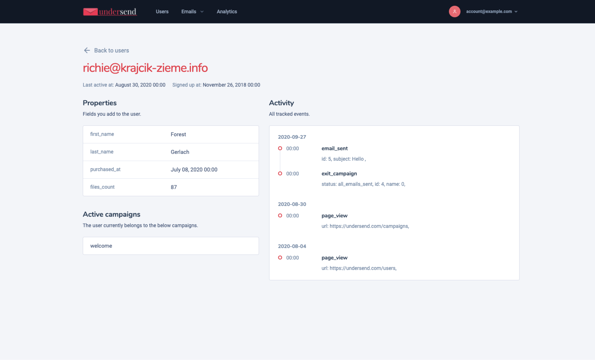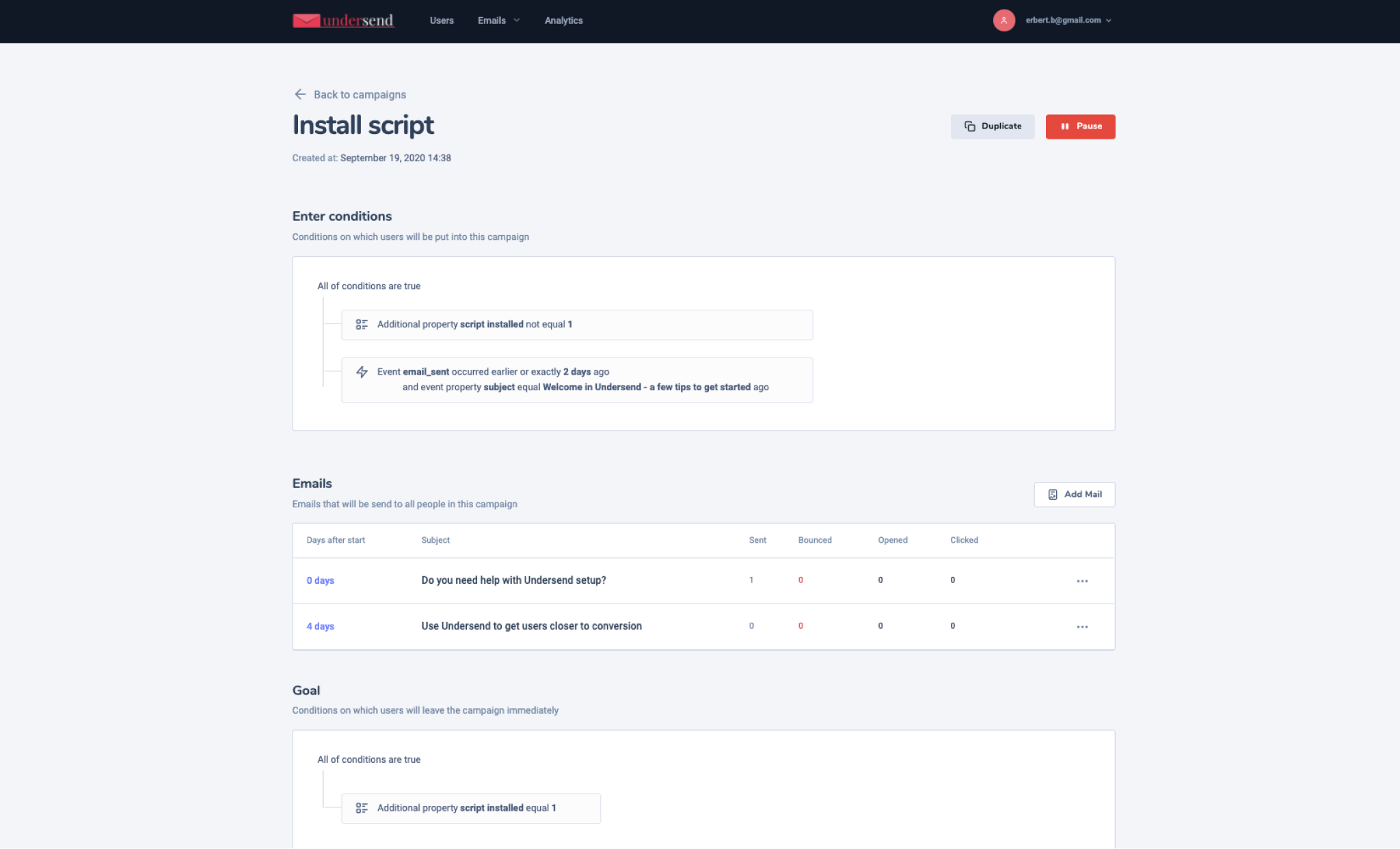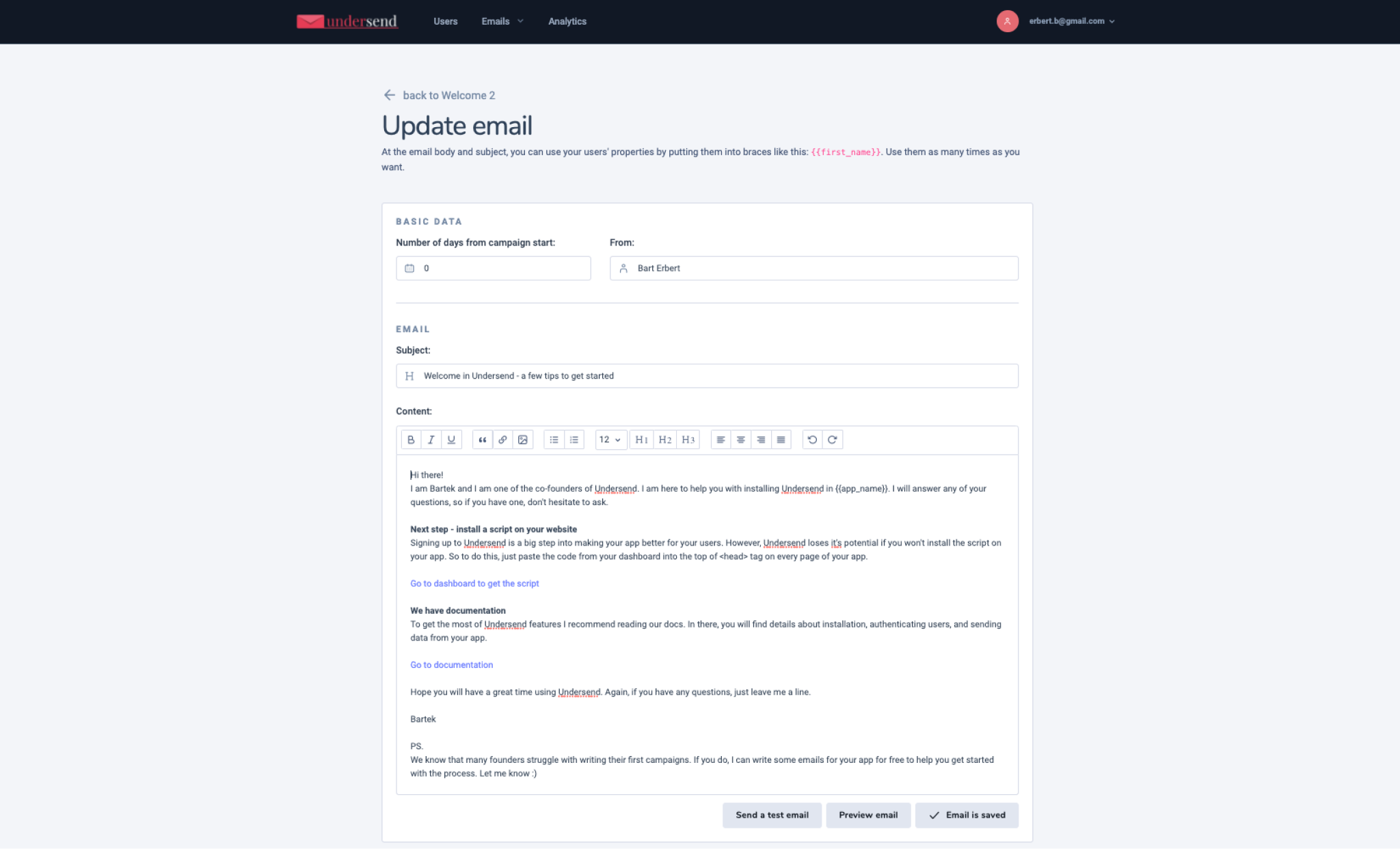 With Undersend, you can create and send personalized marketing campaigns to your users based on their activities. You can trigger a message when a user does or doesn't do an action. Each email can be personalized by the user properties like first name, sign up date, or whatever you want. Personalized messages have a more significant impact on users. Finally, set the campaign goal, measure results, and edit emails to improve outcomes.