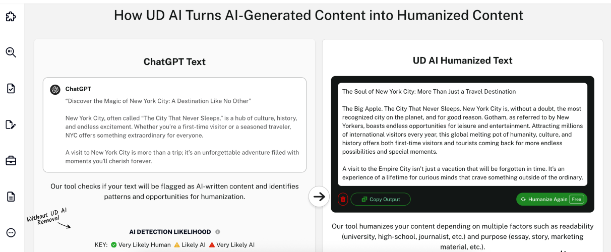 Undetectable.ai is an online rewriting solution designed to transform machine-generated content into writing that reads as if it were produced by a human author. Rather than making surface-level edits, the platform restructures sentences, adjusts pacing, and refines language flow to create text that aligns more closely with natural human writing styles. As a result, content revised with the tool is less likely to exhibit the predictable patterns often associated with large language models such as ChatGPT, Claude, or Gemini. The system focuses on preserving the original message while enhancing clarity and authenticity. By modifying sentence variation, emphasis, and linguistic nuance, it helps reduce the chance that rewritten material will be categorized as AI-generated by common detection systems. Undetectable.ai supports long-form content, multiple languages, and includes built-in verification features that allow users to review how natural their text appears before publication. This makes it a practical option for individuals and organizations producing academic work, professional documents, digital marketing copy, or editorial content that requires a more human-like presentation without altering intent.