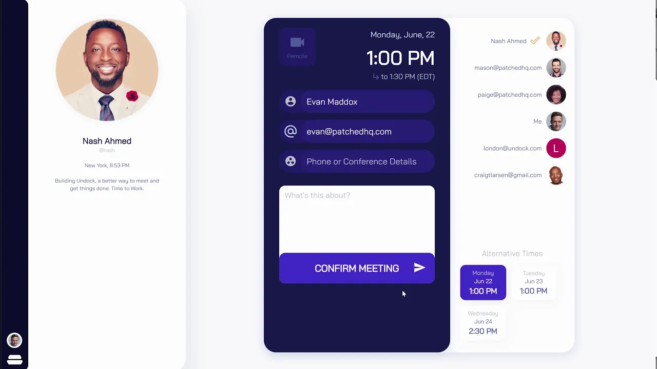 Instantly schedule, host and document meetings with your network. Undock learns when and how you like to meet. Our AI connects people across different organizations, calendar tools, and time zones to find a time that works. Maintain a schedule that fits your needs. Discover scheduling magic with Undock.