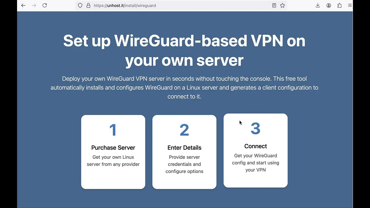 Deploy your own WireGuard VPN server in seconds without touching the console. This free tool automatically installs and configures WireGuard on a Linux server and generates a client configuration to connect to it.