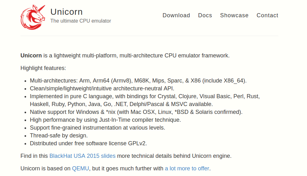 Highlight features: -Multi-architectures: Arm, Arm64 (Armv8), M68K, Mips, Sparc, & X86 (include X86_64). -Clean/simple/lightweight/intuitive architecture-neutral API. -Implemented in pure C language, with bindings for Crystal, Clojure, Visual Basic, Perl, Rust, Haskell, ---Ruby, Python, Java, Go, .NET, Delphi/Pascal & MSVC available. -Native support for Windows & *nix (with Mac OSX, Linux, *BSD & Solaris confirmed). -High performance by using Just-In-Time compiler technique. -Support fine-grained instrumentation at various levels. -Thread-safe by design. -Distributed under free software license GPLv2.