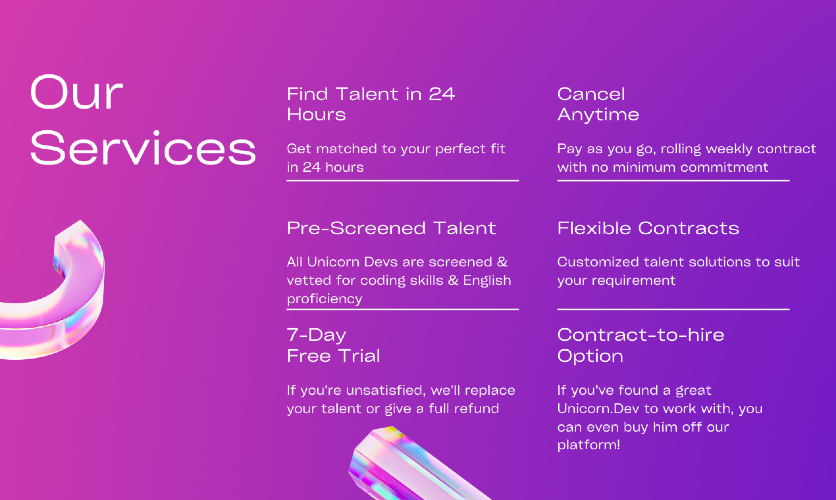 Unicorn.Dev is a pool of hand-selected & rigorously vetted tech talents that can help clients build products fast & at affordable rates. This global network comprises of senior developers & designers that are assigned in 24hrs, at a flat rate of 35USD/hour.