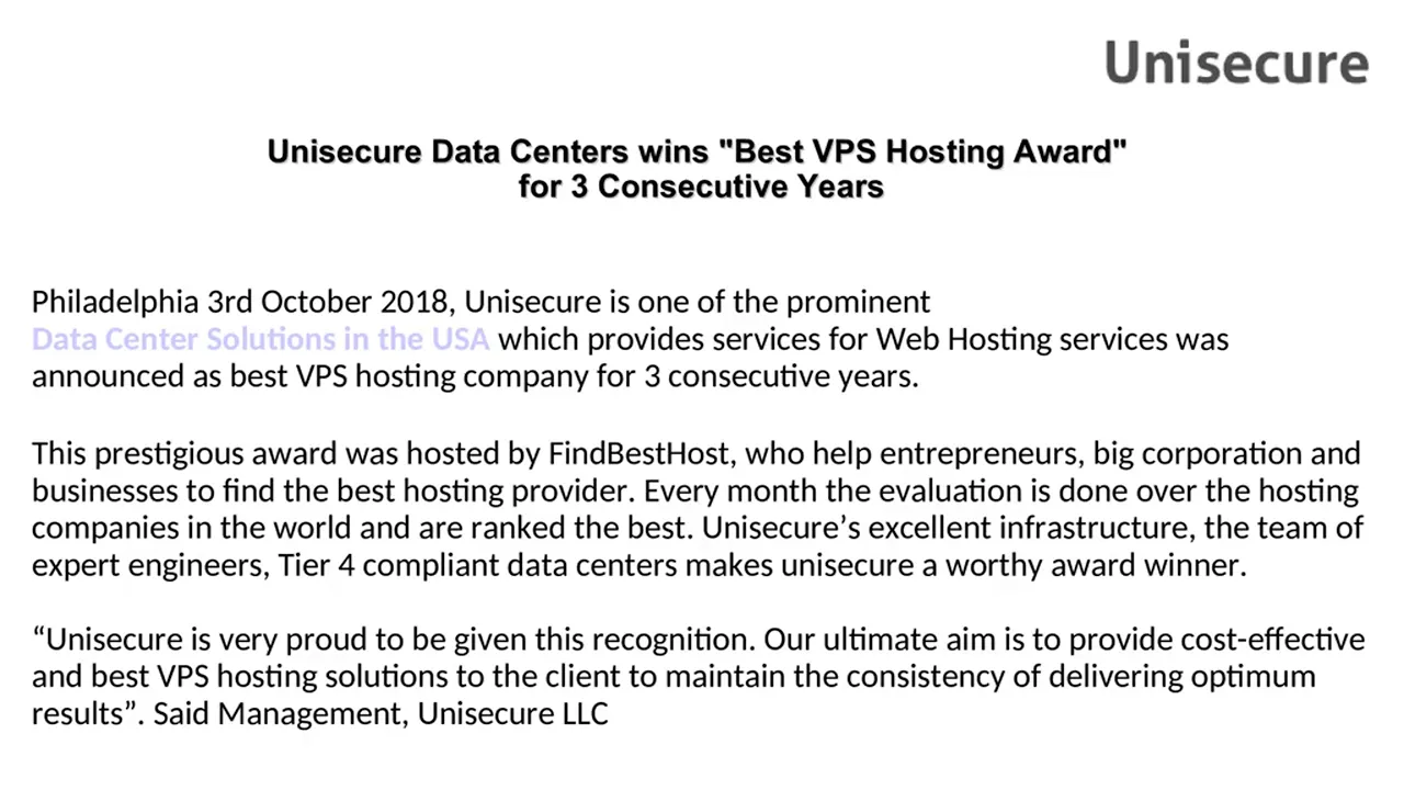 Unisecure: Data Centers and Web Hosting service providers in for below 1. VPS hosting - Virtual Private server 2. Cloud Web Hosting services 3. Dedicated Server with unlimited hosting space and Bandwidth Buy our hosting server services at affordable price. For more get in touch with us on +1 347 960 6628 this number or check our website : www.unisecure.com