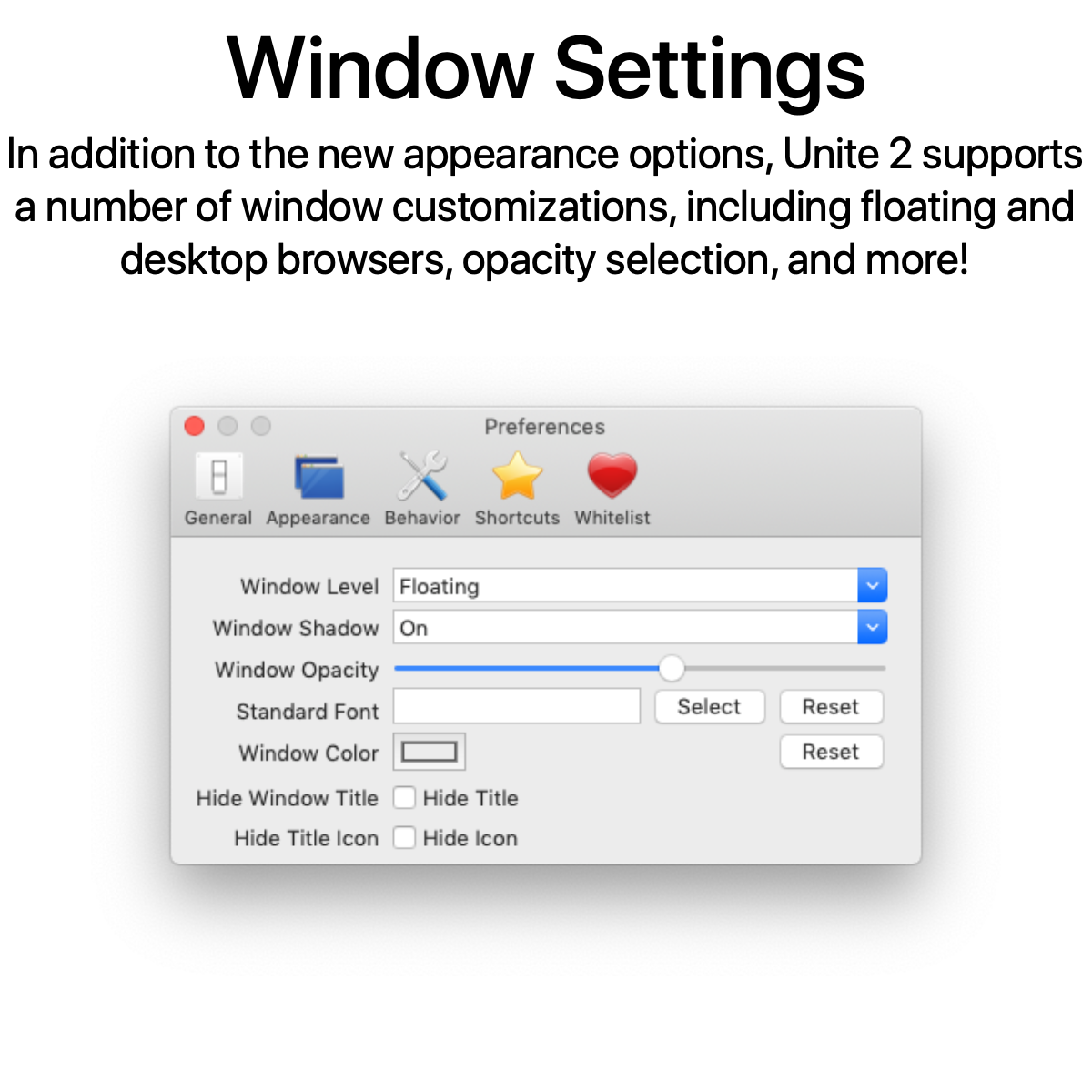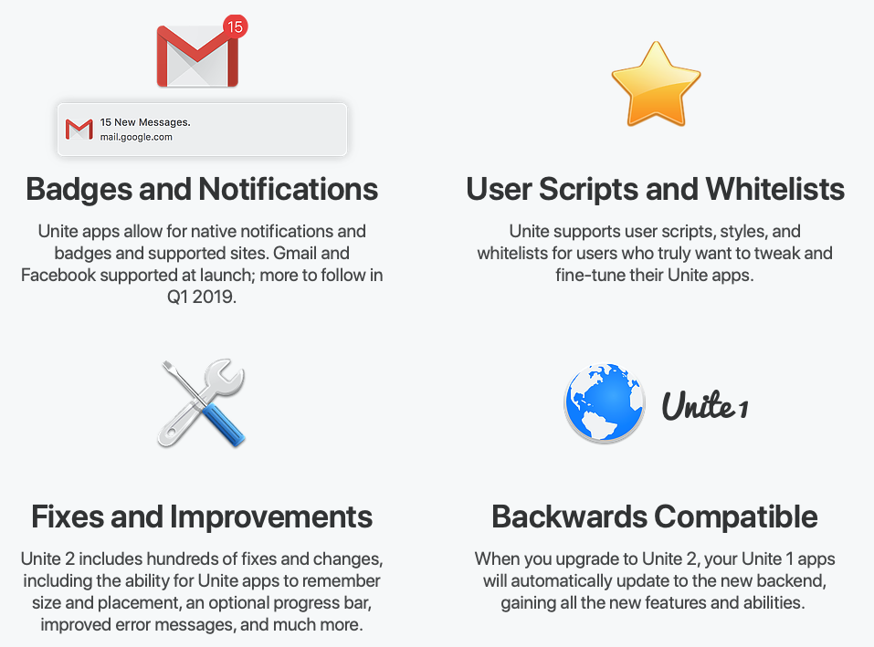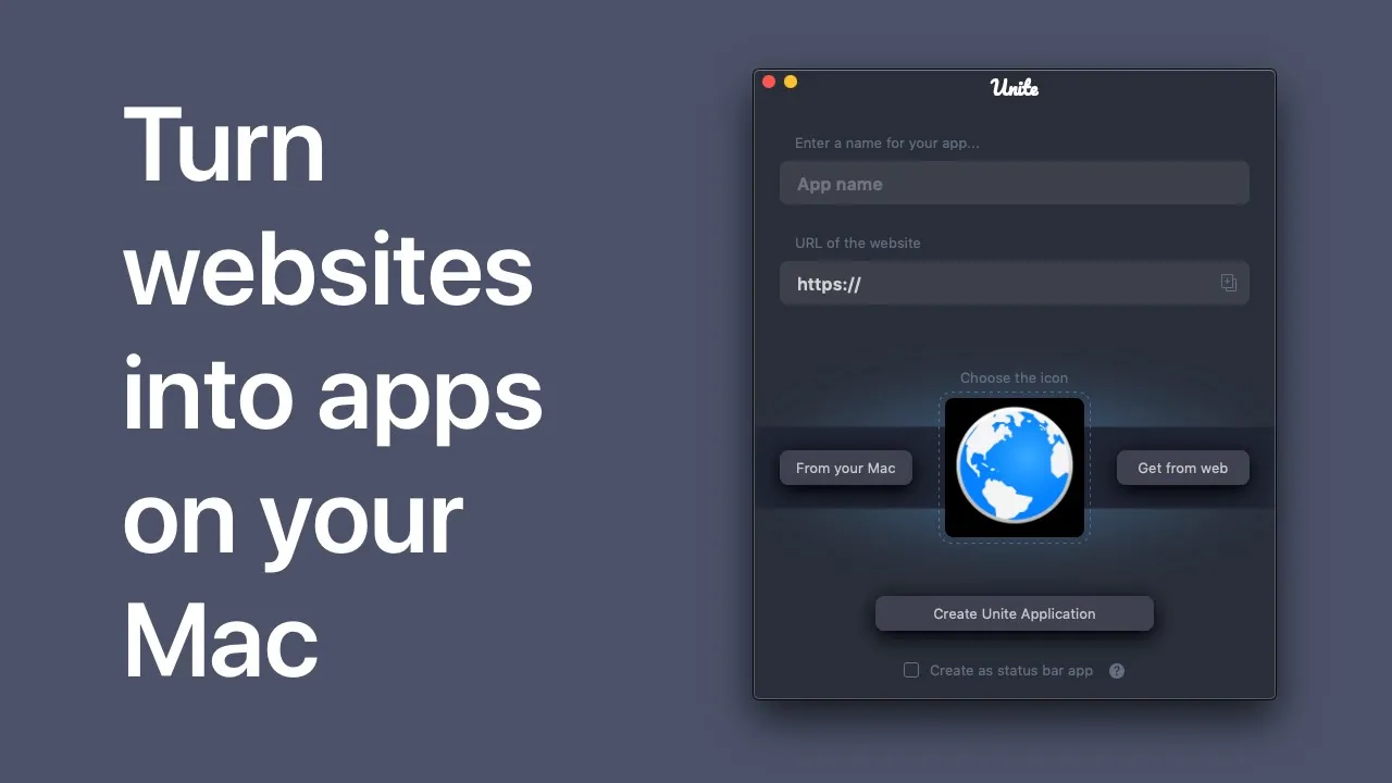 Unite 2 for macOS allows you to quickly and easily turn websites into apps on your Mac, and much more. With Unite 2, we've completely rewritten the backend using WebKit 2, added industry-first customization options, and much, much more. A few of the over 100 new tricks include: Improved status bar apps Full screen support Improved notifications