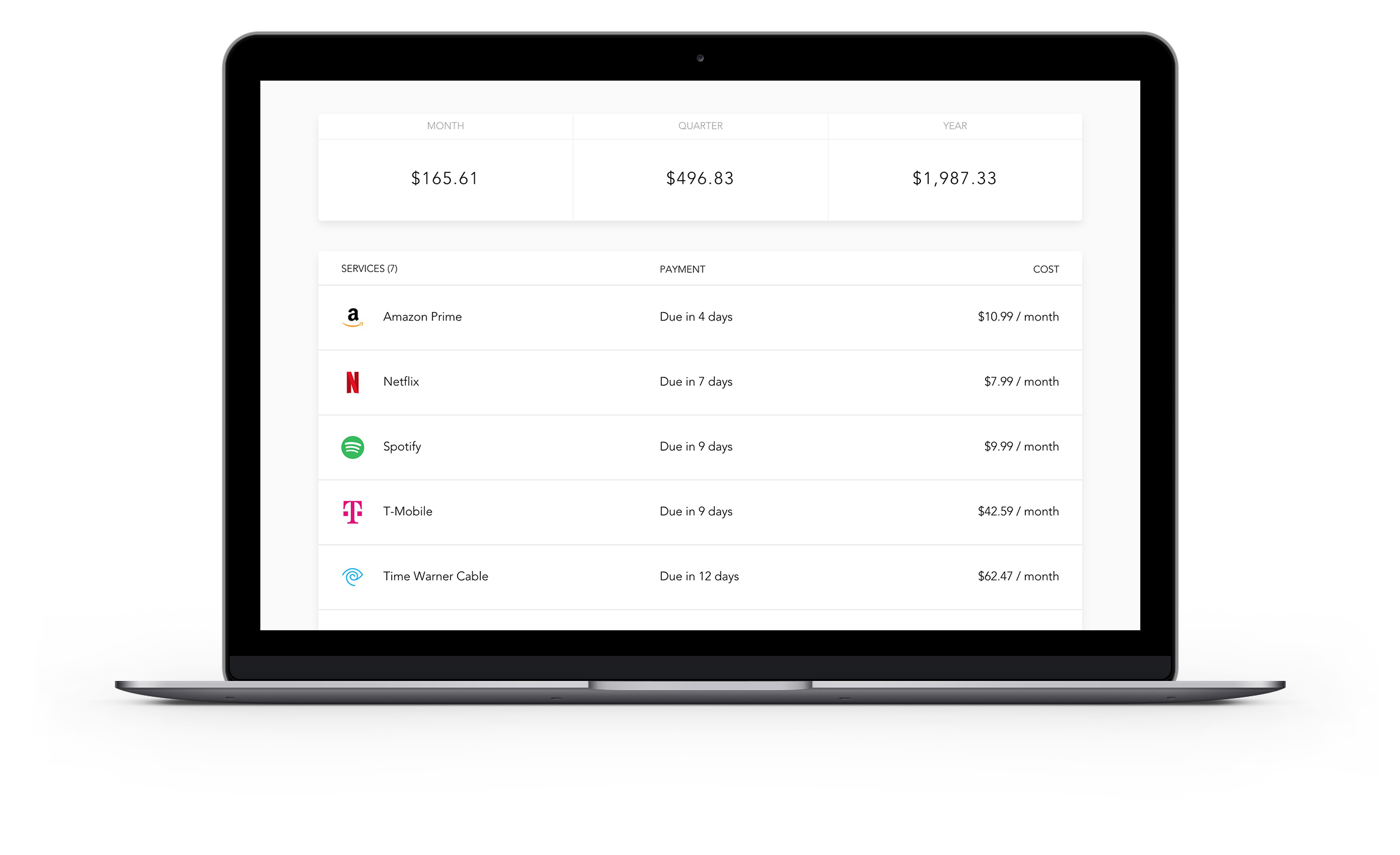 Track what you spend on subscriptions Get an overview of what you spend on services such as Netflix, Amazon Prime, T-Mobile and more. -Connect Securely connect to your bank account or select from our list of subscriptions -Select Select which subscriptions you want to track and add custom info such as notes -Ready View your subscriptions on one simple dashboard and gain control of your finances