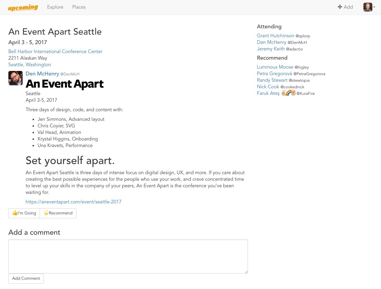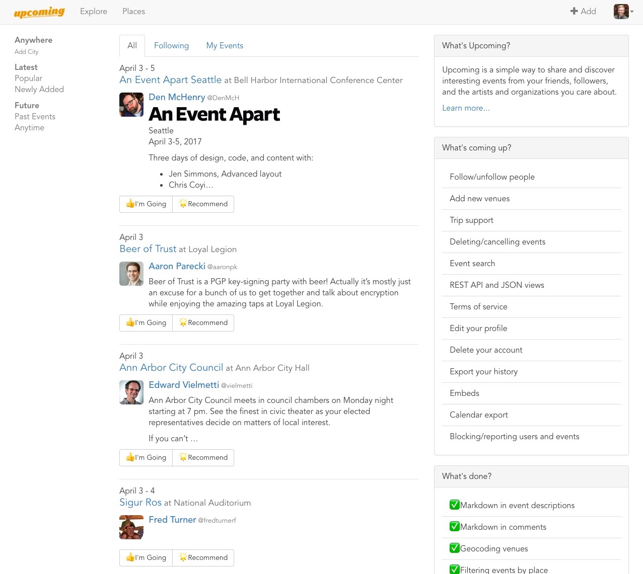 Upcoming is a simple way to share and discover interesting events from your friends, followers, and the artists and organizations you care about.