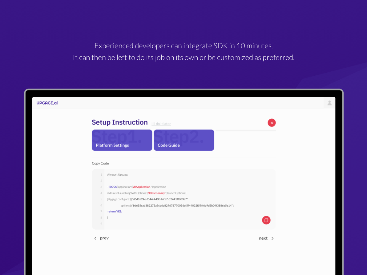 Upgage.ai is an automated tool to boost mobile app user engagements. It analyzes each user's usage patterns and sends right notifications at the right moments. Experienced developers can integrate the SDK into existing apps in less than 10 minutes. It can then be left fully automated or be customized as preferred.