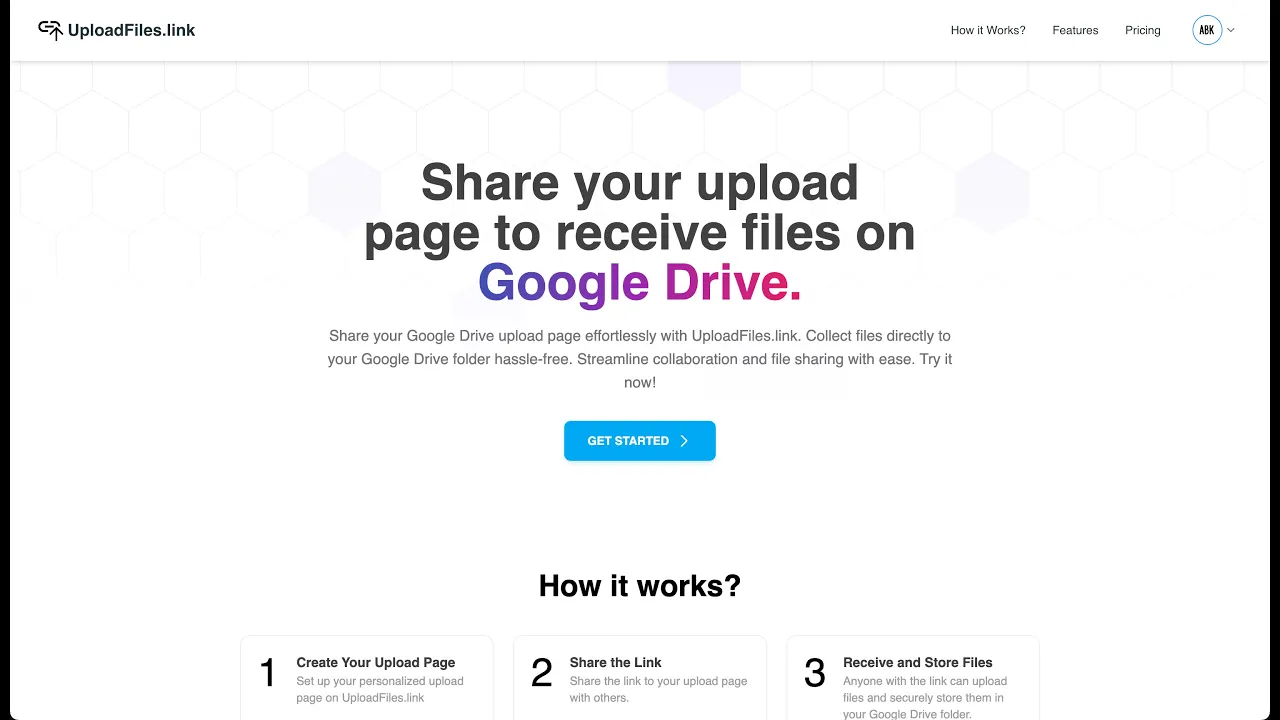 What is UploadFiles.link? UploadFiles.link is a convenient service for transferring files directly to Google Drive. It allows users to create a unique upload page and share it with others for easy file submissions. The platform supports a variety of file types and offers features like multiple file uploads and time-limited links. While the basic service is free, a premium option adds enhanced features like increased upload limits and customizable branding for $4.99/month. Features š±ļø Easy File Uploads Simplifies the file receiving process with a few clicks. š Shareable Upload Links Allows easy sharing of upload pages via unique links. š Multiple File Uploads Supports uploading multiple files at once for efficiency. š Flexible File Type Support Allows a wide range of file types while ensuring only specific formats are uploaded for secure and versatile submissions. ā³ Time-Limited Upload Links Provides upload links with set expiration times to maintain control over file submissions.