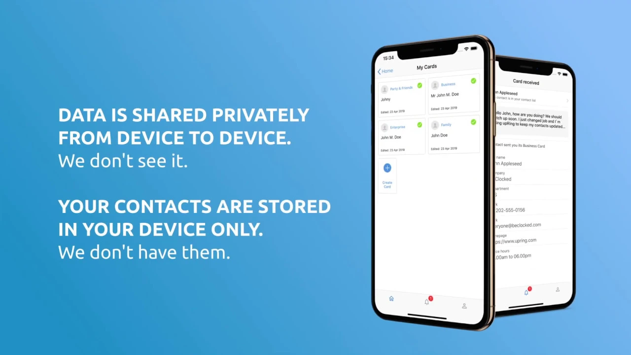 In a world where privacy is becoming an ever growing problem in the digital-sphere, we felt a moral obligation to develop a proprietary technology that safeguards information while maintaining the same feature flexibility you would expect from a non privacy-conscious world. We figured that the best way to protect your data was by not having it at all. upRing is an app that allows users to maintain an always organized and up-to-date enhanced private contact list, but also offers users a private and safe way to share with selected contacts updated personal contact details. Discover how reliable your contact list is, send and receive unlimited business Cards with verified contact information safely from device to device, backup your activity and contacts to *your* iCloud or Google Drive, clean your duplicates, create custom groups to organize your contacts and much more.