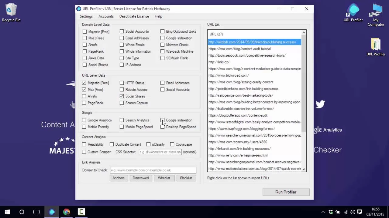A powerful tool for SEOs to quickly audit links, content & social data URL Profiler doesn't just do one task; it can be configured to retrieve a large array of link, content and social data for almost ANY task. Thousands of URLs at once - with no limits or constraints - just the data you need, when you need it. -Backlink Checker Quickly checks your backlinks and returns in depth anchor information. -Site Types Scans the site to identify the type of site and software used. -Link Metrics Downloads bulk link metrics from Mozscape, Majestic SEO and Ahrefs. -Email Harvesting Scrapes, harvests and extracts website email addresses. -Readability Score Calculates content quality statistics and 5 separate readability scores. -Social Accounts Finds Twitter, Facebook, Google+, LinkedIn and Pinterest account links, etc.