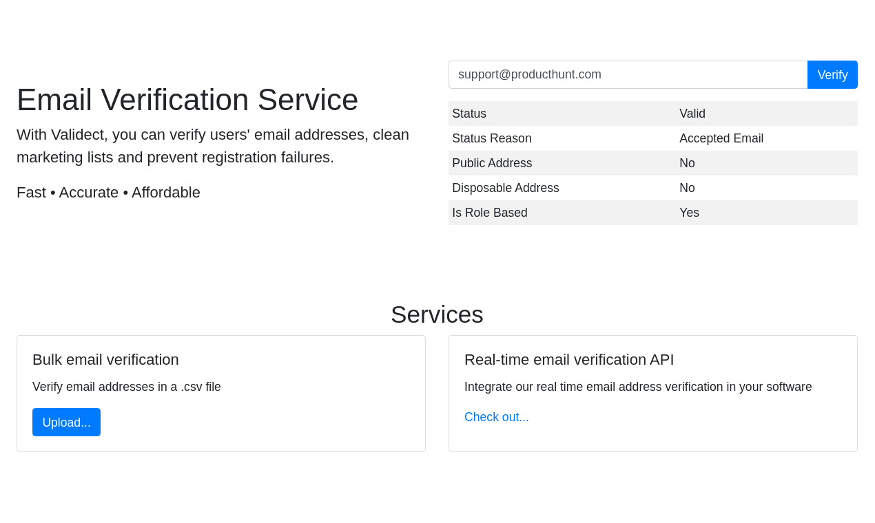 Need to clean marketing list to reduce bounce rate? Or maybe you need to protect a contact form from spam? Validect - email verification service can help!