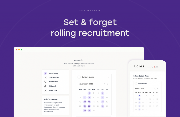 Many product teams are moving too fast for fixed research projects, they know they should be doing more research, yet are time-poor, lack access to dedicated researchers/ resources for dedicated streams, and find internal research documents outdated, abstract and lofty. Without an efficient way to uncover customer needs and validate assumptions directly, uninformed decisions are being made regularly with bias and guesswork. It’s time we did better. Product teams are adopting continuous discovery to address this need. Running interviews in smaller numbers; in weekly, bi-weekly or monthly intervals. They regularly uncover findings which are tactical, lean and current. That’s where we come in. Validly is a toolkit for product teams to run lean continuous user interviews, validate ideas and know what to build next. Teams that use validly enjoy: 1. digitised end-to-end research operations 2. user interviews synchronised with delivery cycles 3. habitual, lean and effortless user interviews