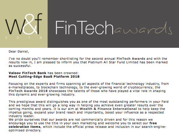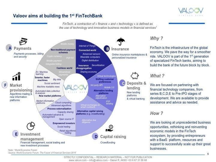 Dear Investors, We are the value investors of the future. Valoov is the best way to prepare for Black Swans in the financial services. FinTech is the infrastructure of the new economy and we are paving the way for a smoother ride. If you are in search of the next "big elephant", this is a once in a lifetime opportunity. Valoov is a great business a "young elephant", early enough to enjoy a long run of growth and mature enough to allow for a confident assessment. We are currently looking to partner with a strategic PRIVATE Investor who holds a banking license and 3M equity. "Valoov First, Innovation First, Entrepreneur First, Liberty First" We are “RADICALY TRANSPARENT”, you can ask us the question that misses you to partner with us.