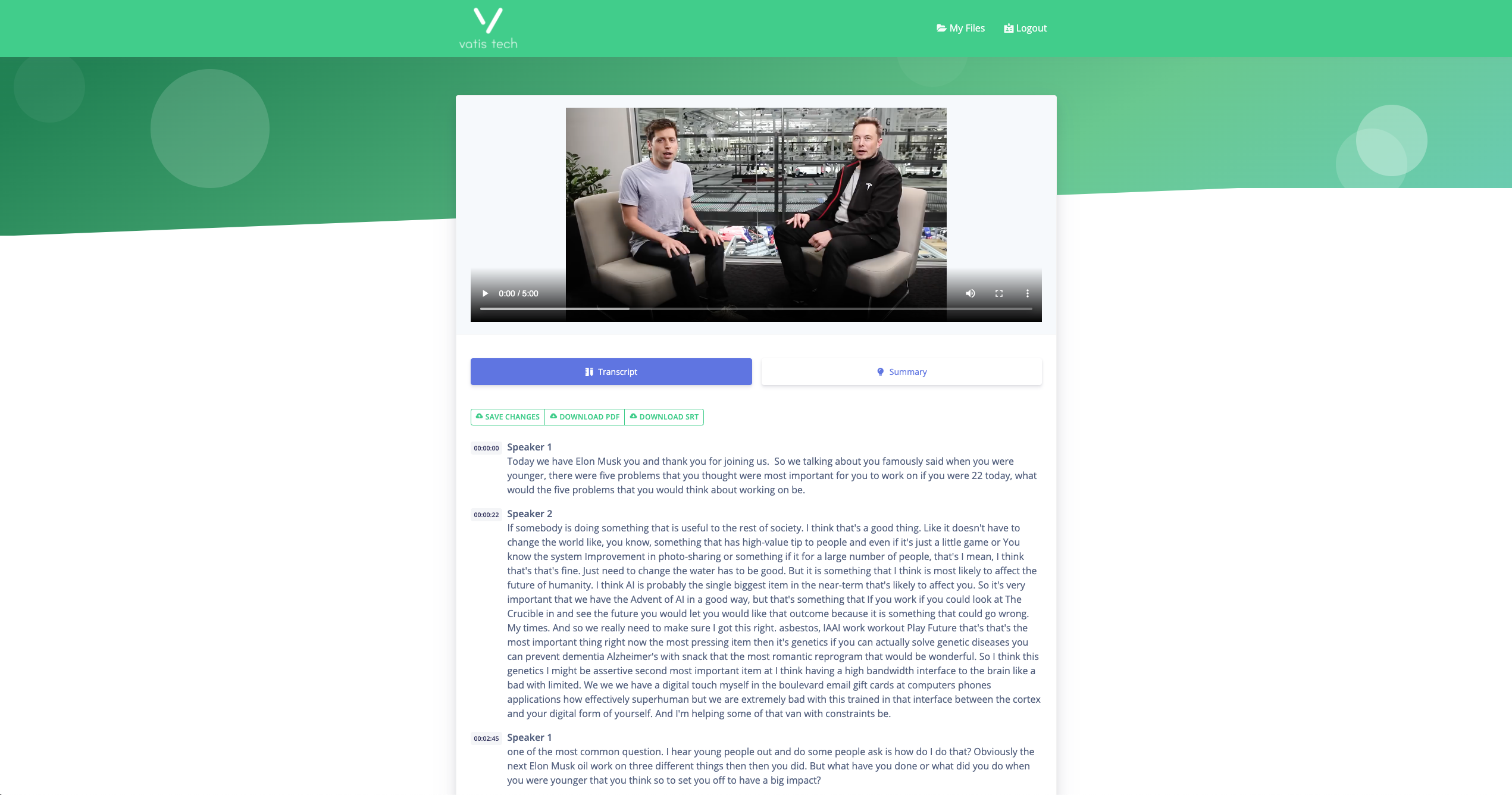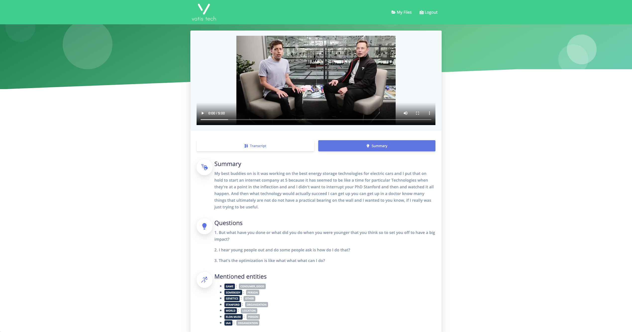 Vatis Tech is a fast, accurate and insightful transcript and summary service. By offering an editable transcript, extracting a list of questions, mentioned entities and providing a short description based on most meaningful ideas, VatisTech saves countless hours when working with audio-video content. We started Vatis Tech with the desire to index audio-video content in order to make it easy to search for information in it. But we thought that, while this on its own does bring a lot of value and we managed to achieve it by providing a transcript, we could go a step further and provide our users some pieces of information even before looking for them. Hence we extract the questions in the audio-video file, the mentioned entities such as people names, institutions, places or organisations, and we also try to provide a short description of the whole audio content by extracting the most meaningful ideas. We put all this together in what we call a summary. Currently we support 10 languages for transcript (English, Romanian, Czech, Danish, German, Spanish, Finnish, French, Italian,Swedish) and 5 languages for summary (English, Danish, French, Spanish, Italian). But they are continuously under development and this week will come with other new languages based on what our users request. We trust our product will save countless hours spent on transcribing and creating content notes to podcasters, journalists and all of you cool kittens that work heavily with audio and video. We’re happy to hear any feedback and questions you might have. By the way, if you register today you will get the first 90 minutes free. Thank you for giving it a try!