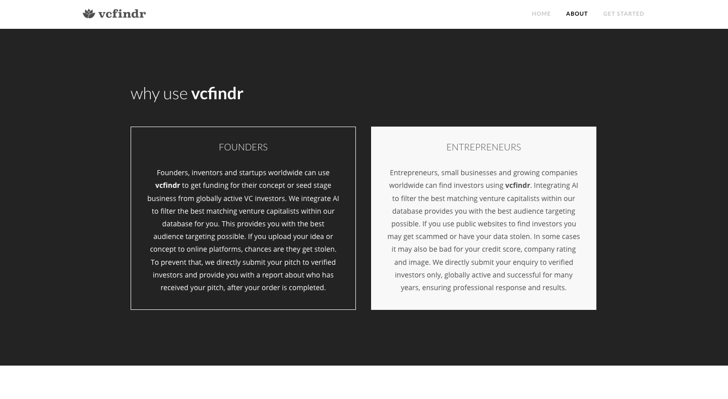 We connect founders, inventors, startups and entrepreneurs worldwide with matching venture capital, accessing over 10,000 verified, globally active investors directly. All it takes to be a part is just a few simple steps. We integrate AI to ensure the best service quality possible and are dedicated to helping our users in succeeding. Founders / Inventors : If you upload your ideas or concepts to online funding platforms, chances are they get stolen. To prevent that, we directly submit your pitch to verified investors and provide you with a report about who has received your pitch. Entrepreneurs : If you use public websites to find investors you may waste your time with wannabe-investors or have your data stolen. In some cases it may also be bad for your credit score, company rating and image. We directly submit your enquiry to verified investors only, globally active and successful for many years, ensuring professional response and results.
