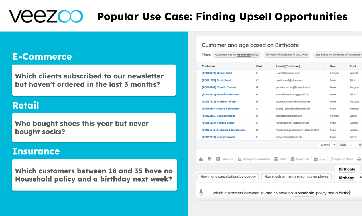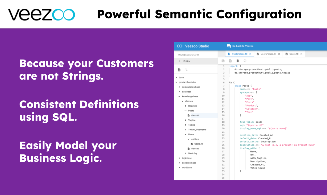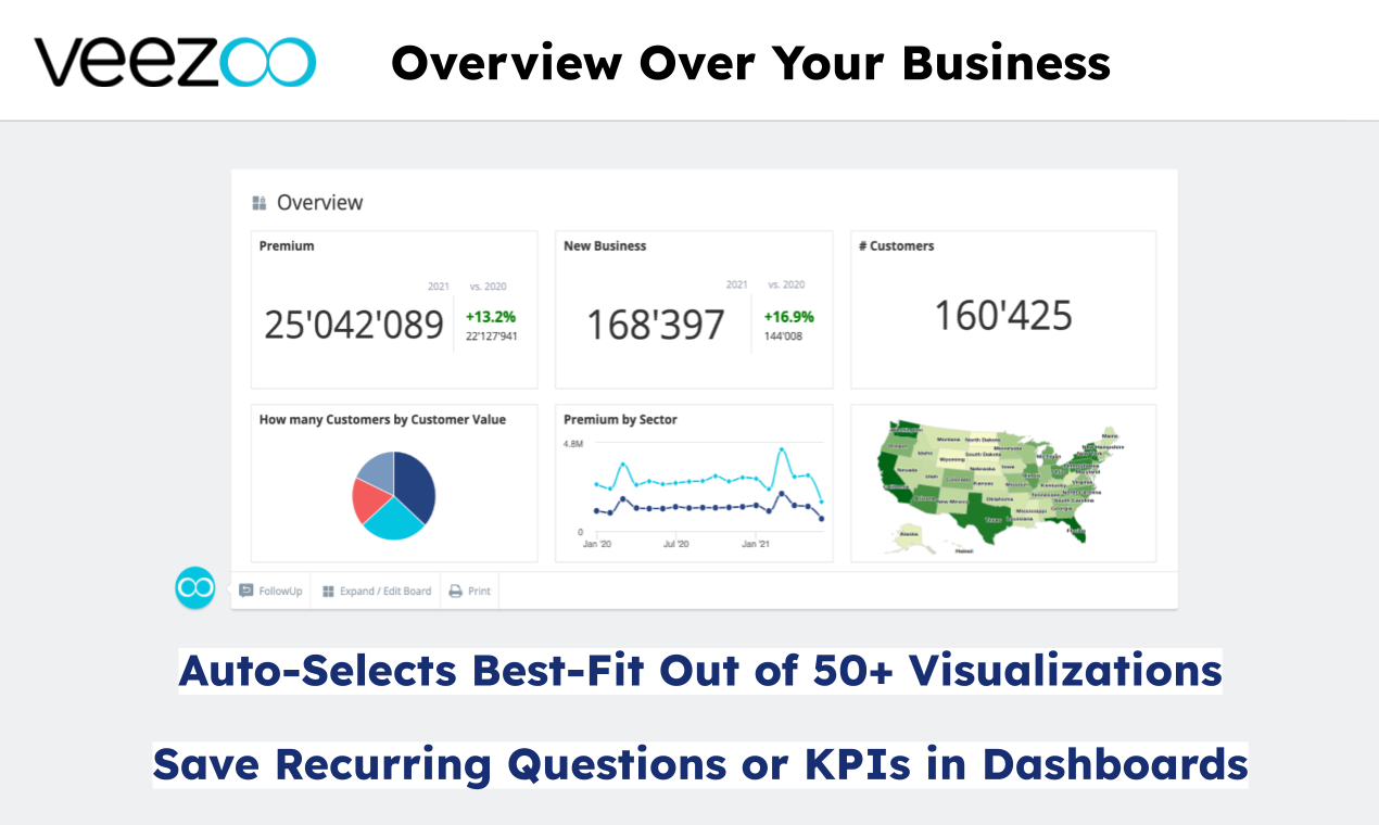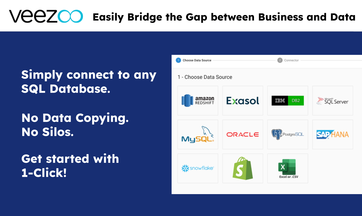 Veezoo: Real Self-Service Analytics needs to speak your language. Veezoo is a chat-based data analytics solution that empowers anyone to find actionable insights from data by literally just asking their questions in plain English! Ask questions and get answers in seconds in the form of meaningful data visualizations. Veezoo is on a mission to empower individuals at every level of the organisation to make real-time, data-driven decisions that move the organization forward. Powered by a highly-configurable, industry-leading AI data backend and an easy-to-use chat-based system, Veezoo replaces traditionally inefficient drag-and-drop analytics with an intuitive, conversational interface so that anyone can discover actionable insights in seconds - no coding required!. To learn more about Veezoo and why natural language is the key to democratizing data and creating data-driven organizations, visit veezoo.com.