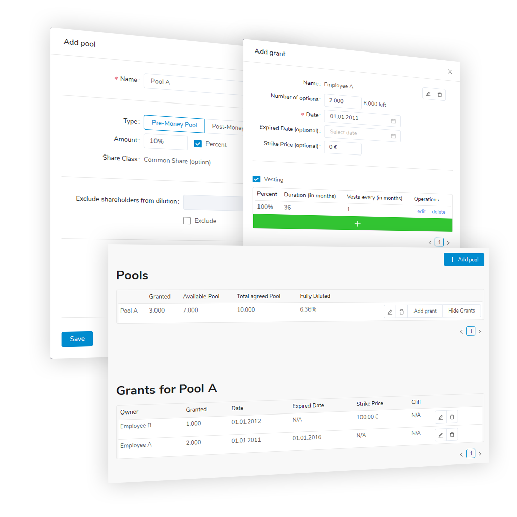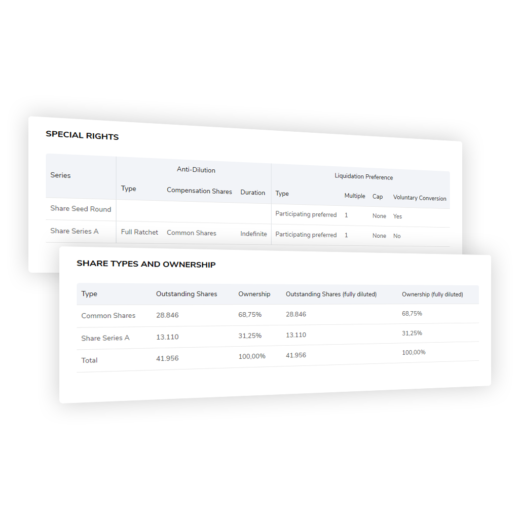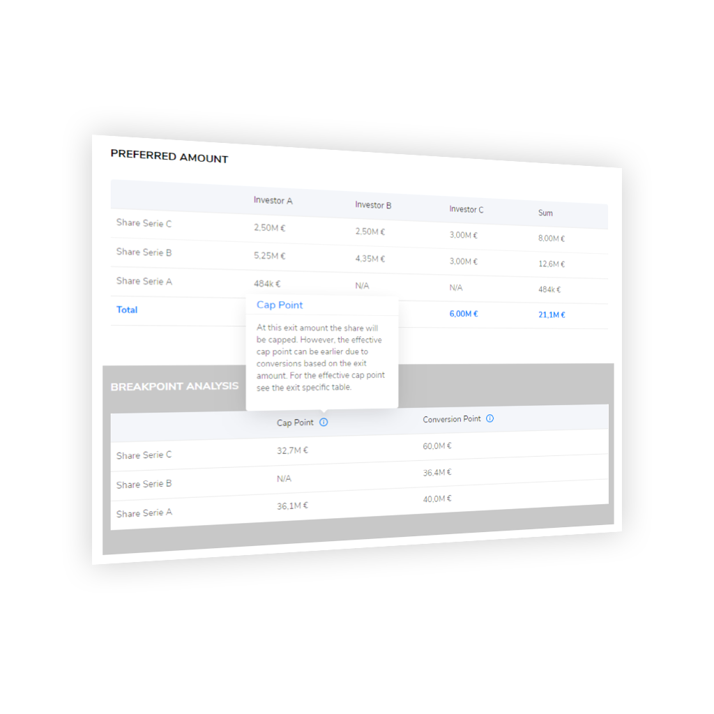 Ventury Analytics offers a web based cap table management for start ups and investors. Our premium features include exit modeling with different kind of liquidation preferences as well as a modelling tool to show effects of different future round scenarios. We help our users to make an optimized decision within their negotiation process.