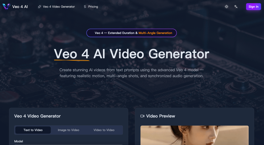 Veo 4 AI empowers you to bring your visions to life with captivating AI-generated videos. Utilizing the cutting-edge Veo 4 model, you can effortlessly transform text prompts into high-quality, visually stunning videos. No video editing skills required! Simply enter your desired scene, style, or concept, and Veo 4 AI will generate a unique and original video. Our advanced AI algorithms ensure remarkable realism and detail, resulting in videos that are perfect for a wide range of applications. Need engaging marketing content? Veo 4 AI can create explainer videos, promotional clips, or social media content in seconds. Want to elevate your storytelling? Generate captivating narratives for documentaries, presentations, or personal projects. Veo 4 AI offers unparalleled ease of use. A simple interface allows for quick iteration and experimentation. Experiment with different prompts to achieve the perfect visual. We support a variety of video styles, including cinematic, animated, and realistic. Enjoy high resolution output, suitable for web and print. Veo 4 AI is the future of video creation, democratizing access to professional-quality video production. Start creating amazing videos today! https://tryveo4.app/