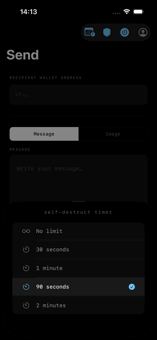 Veylt does not require any formal or identifiable registration, using email or your contact number. Selective Masking Mask sensitive areas of images before sending. Blur or black out exactly what you want hidden with surgical precision. Self-Destruct Timer Set a self-destruct timer on any transfer. Once opened, the clock starts, and the content disappears forever. Scheduled Delivery Choose when your transfer gets delivered. Schedule sends down to the minute for perfect timing. Decoy (Duress) Mode Send a decoy transfer on top of your real one. If a recipient is ever under duress, the attacker sees only what you want them to. Screenshot Forensics Get notified the moment someone attempts to screenshot your transfer, logged with their wallet address and timestamp. Immutable Audit Trail A complete, filterable audit trail of every transfer, unlock, screenshot attempt, and wallet event, all in one place.