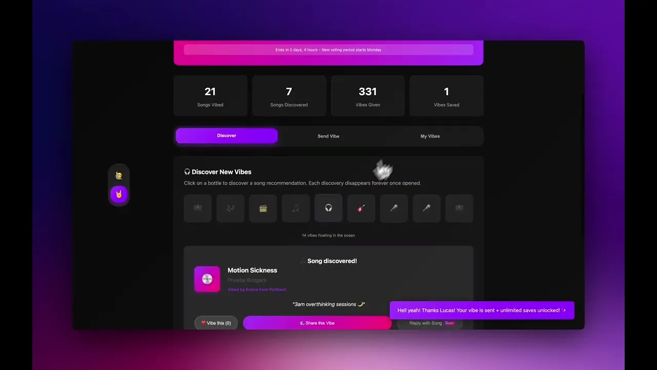 Vibes is a music discovery platform where users find songs through authentic human stories, not algorithms. Users share a song with a personal context attached, like a memory or feeling. These recommendations, or "vibes," drift like messages in a bottle until another user discovers them, at which point they disappear to create a moment of pure serendipity.