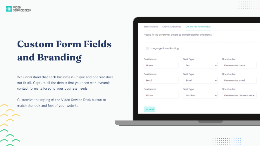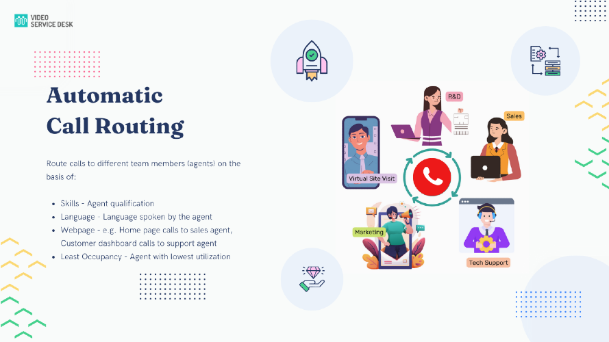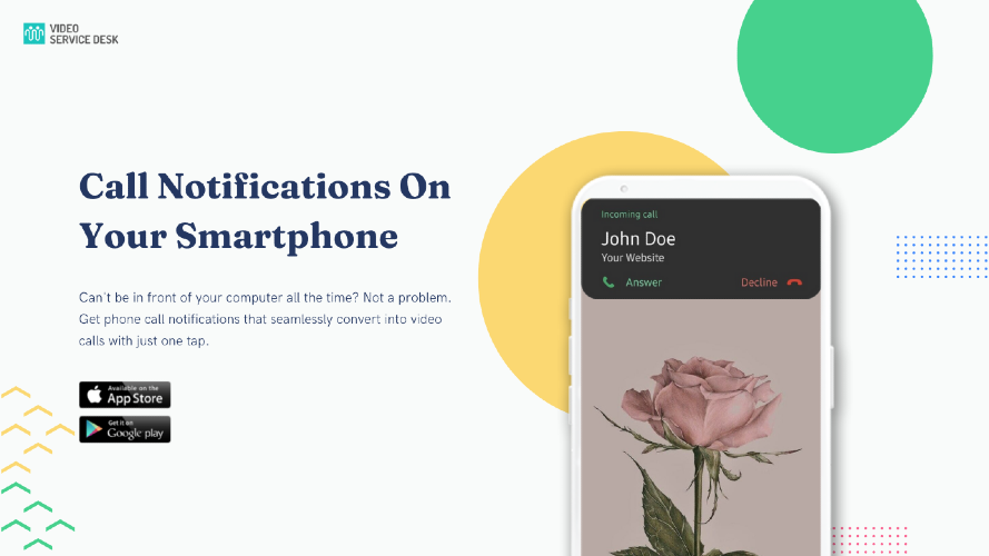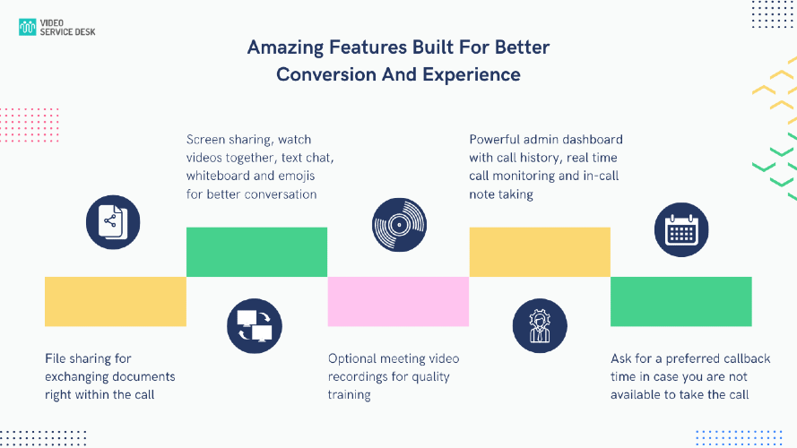 A no-coding-needed, pluggable button similar to the one found on the bottom-right corner of this page. With added features like file sharing & screen sharing. With Video Service Desk You Can Easily Convert Your Web Visitors Into Customers And Retain Them Forever Get phone call notifications that seamlessly convert into video calls with just one tap. Get email notifications for all calls and monitor the calls and agent status within the dashboard. If you a miss a call, the customer will be asked for a preferred call back date and time when you can call them back and close the deal! Cannot be in front of your computer all the time. Missed calls from customers Screen sharing, chat bots and whiteboard not at a same place. Single routing Unlimited audio and HD video calling Unlimited file sharing and video sharing Screen sharing, whiteboard, chat, polls, raise a hand, emojis, and reactions Route calls from multiple websites Access to the admin dashboard and mobile apps Optional video recording and cloud storage at $0.01 per recorded minute Custom Contact Forms Intelligent Call Routing Call Notifications on Your Smartphone In Call Note Taking Agents Realtime Monitoring Powerful Admin Controls