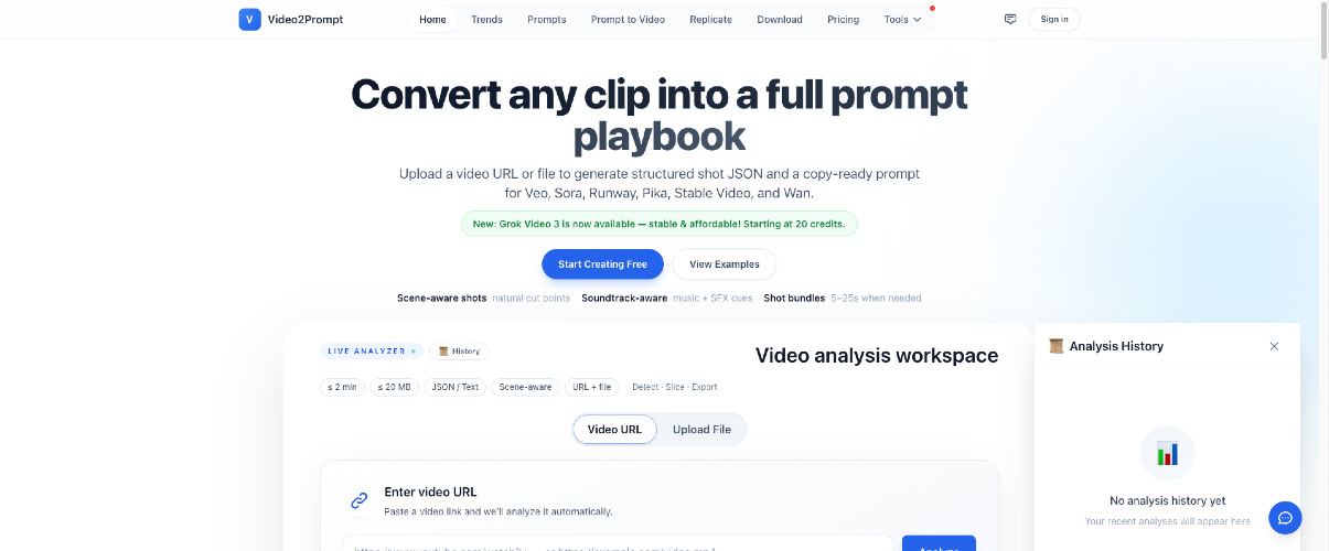 Video to Prompt turns a video URL or upload into structured prompts, shot breakdowns, and reusable JSON for AI video generation workflows. It helps creators extract scenes, timing, camera moves, first-frame details, and audio cues for tools like Veo, Sora, Runway, Pika, Stable Video, and Wan.