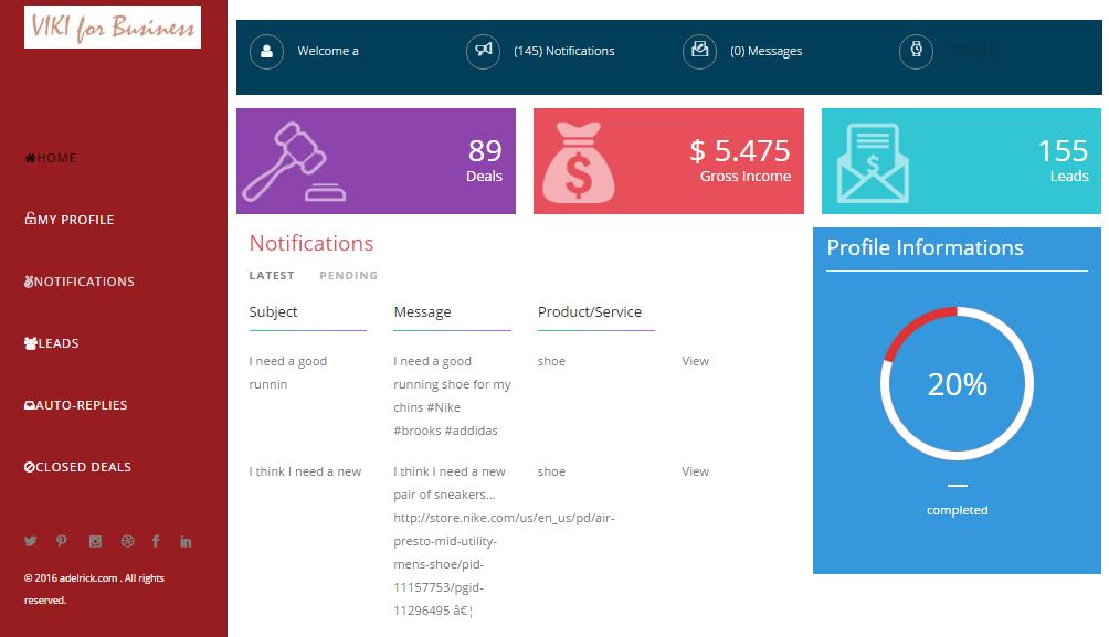 viki4biz is your AI-based virtual sales assistant.She finds new leads from social media networks and automates engagement viki4biz increases leads engagement and revenues. viki4bizlearns and understands user behavior, sales triggers and identifies leads needs on social media networks and specialized sources. Therefore, you spend more time with genuinely interested customers. viki4biz is a simple and convenient AI-based tool to close more deals.